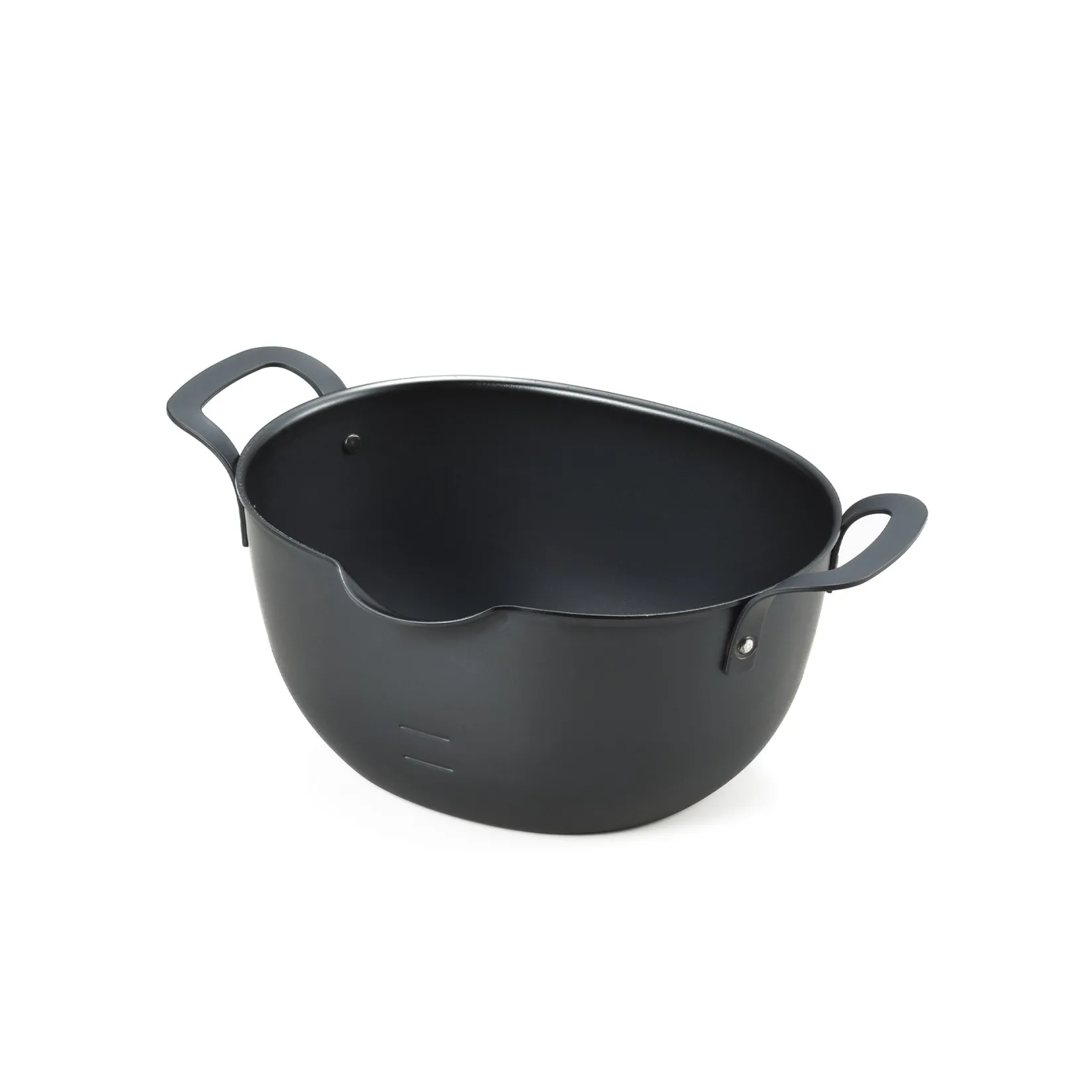 The pot has two handles so you can safely move it around the kitchen. The pouring spout makes it easy to pour away the used oil. Volume measurements are clearly marked inside the pot.