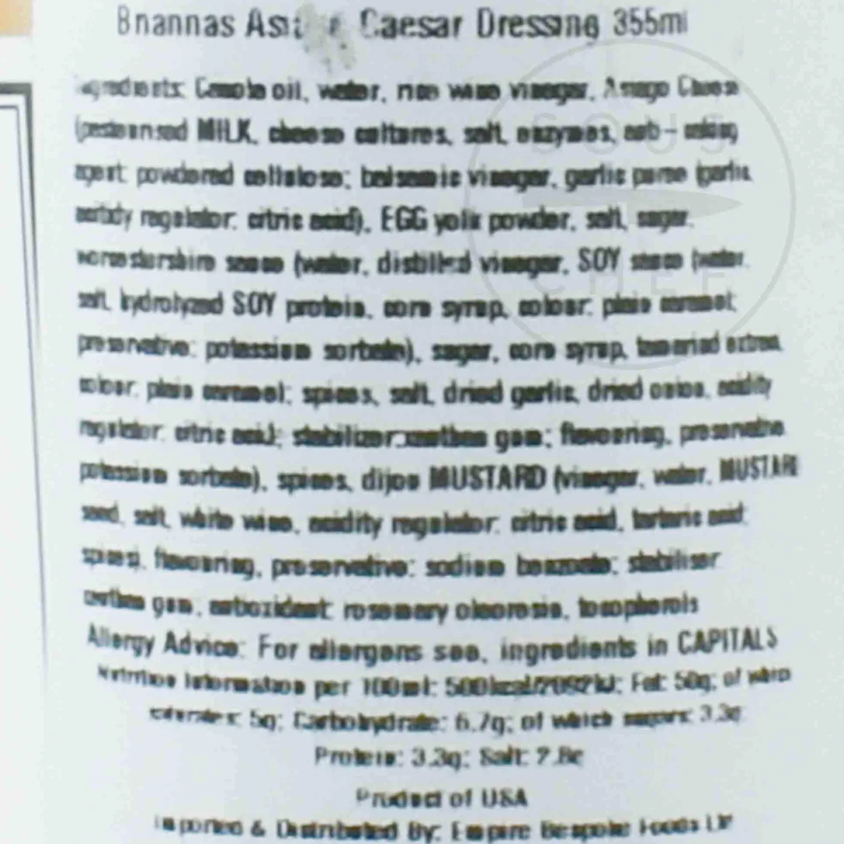 Product formulations and details may change. For the latest ingredients and allergen information always check product packaging prior to consumption. Ingredients: Canola oil, water, rice wine vinegar, asiago cheese (pasteurised milk, cheese cultures, salt, enzymes, anti-caking agent: powdered cellulose; balsamic vinegar, garlic puree (garlic, acidity regulator: citric acid), egg yolk powder, salt, sugar, worcestershire sauce (water, distilled vinegar, soy sauce (water, salt, hydrolyzed soy protein, corn syrup, colour: plain caramel; preservative: potassium sorbate), sugar, corn syrup, tamarind extract, colour: plain caramel; spices, salt, dried garlic, dried onion, acidity regulator: citric acid; stabiliser: xanthan gum; flavouring, preservative: potassium sorbate), spices, dijon mustard (vinegar, water, mustard seed, salt, white wine, acidity regulator: citric acid, tartaric acid; spices), flavouring, preservative: sodium benzoate; stabiliser: xanthan gum; antioxidant: rosemary oleoresin, tocopherols