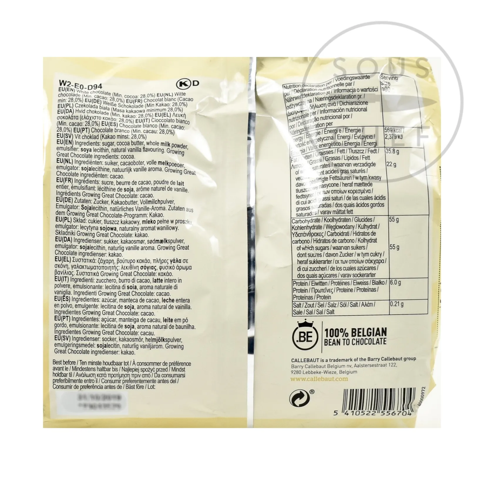 Callebaut white couverture has intensely creamy, milky notes. The all-purpose stunning quality white chocolate can be used for making ganaches, sauces, ice creams, pralines and for doing chocolate work – such as moulding hollow figures, and intricate decorating. It can even be combined with dark chocolate or milk chocolate couverture to achieve a two-colour effect in chocolate decoration or swirls in chocolate brownies.