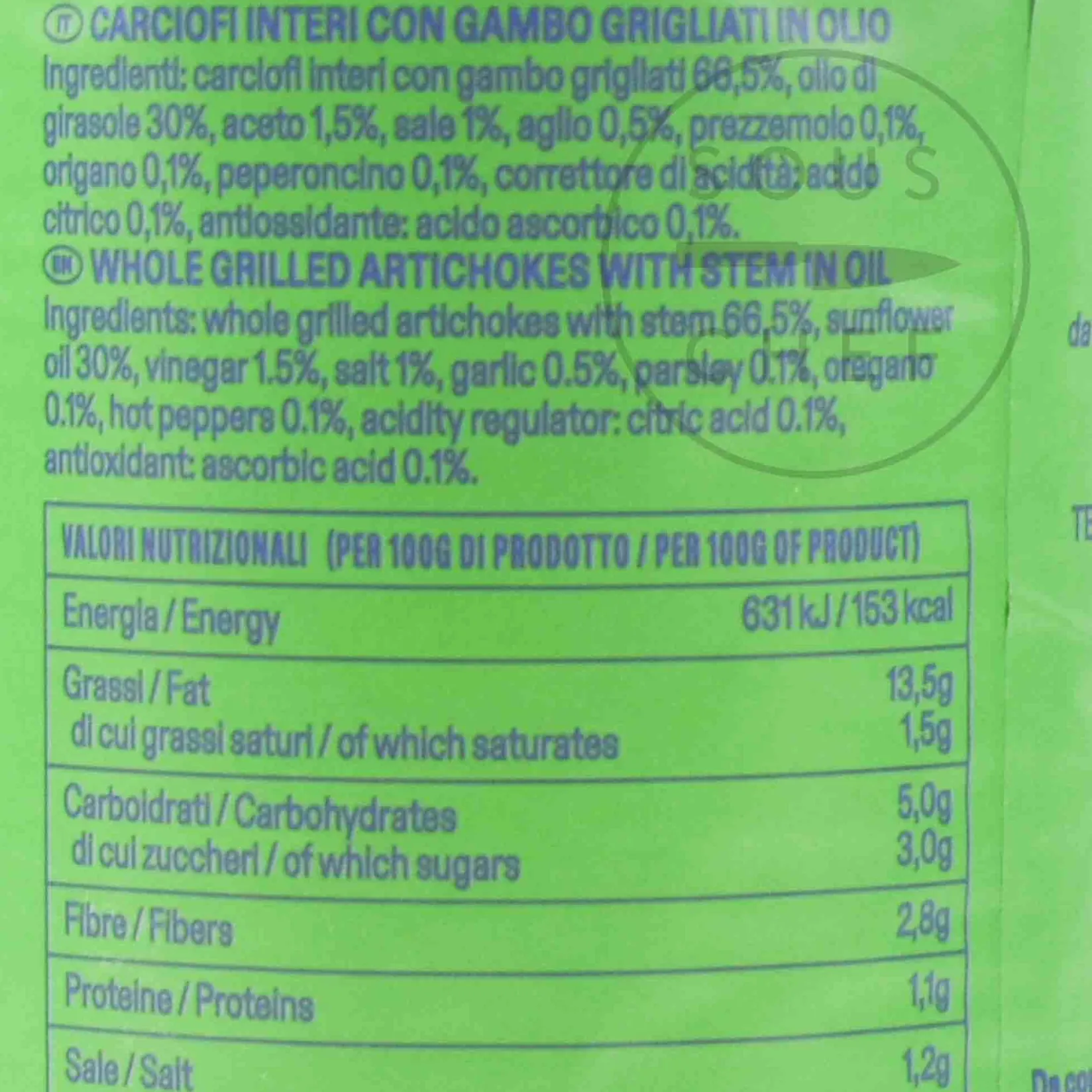 Product formulations and details may change. For the latest ingredients and allergen information always check product packaging prior to consumption. Ingredients: Artichokes, sunflower oil, vinegar, salt, garlic, parsley, oregano, hot pepper, acidity regulator: citric acid; antioxidant: ascorbic acid.
