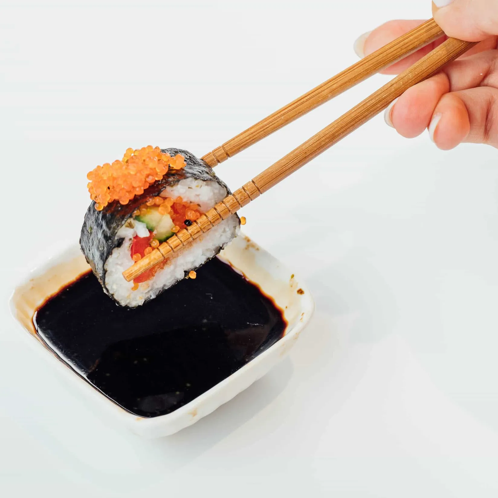 When you taste the orange seaweed caviar alone, it’s very slightly sweet. But once added to dishes, you won’t notice. And it has the satisfying crunch of real tobiko roe. It’s a fantastic substitute!