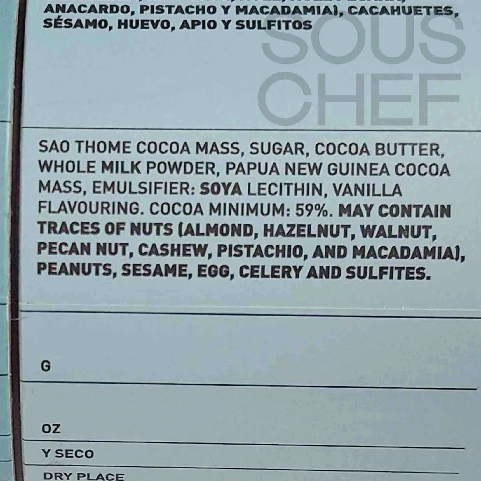Product formulations and details may change. For the latest ingredients and allergen information always check product packaging prior to consumption. Ingredients: Sao thome cocoa mass, sugar, cocoa butter, whole milk powder, papua new guinea cocoa mass, emulsifier: soya lecithin, vanilla flavouring. cocoa minimum: 59%.