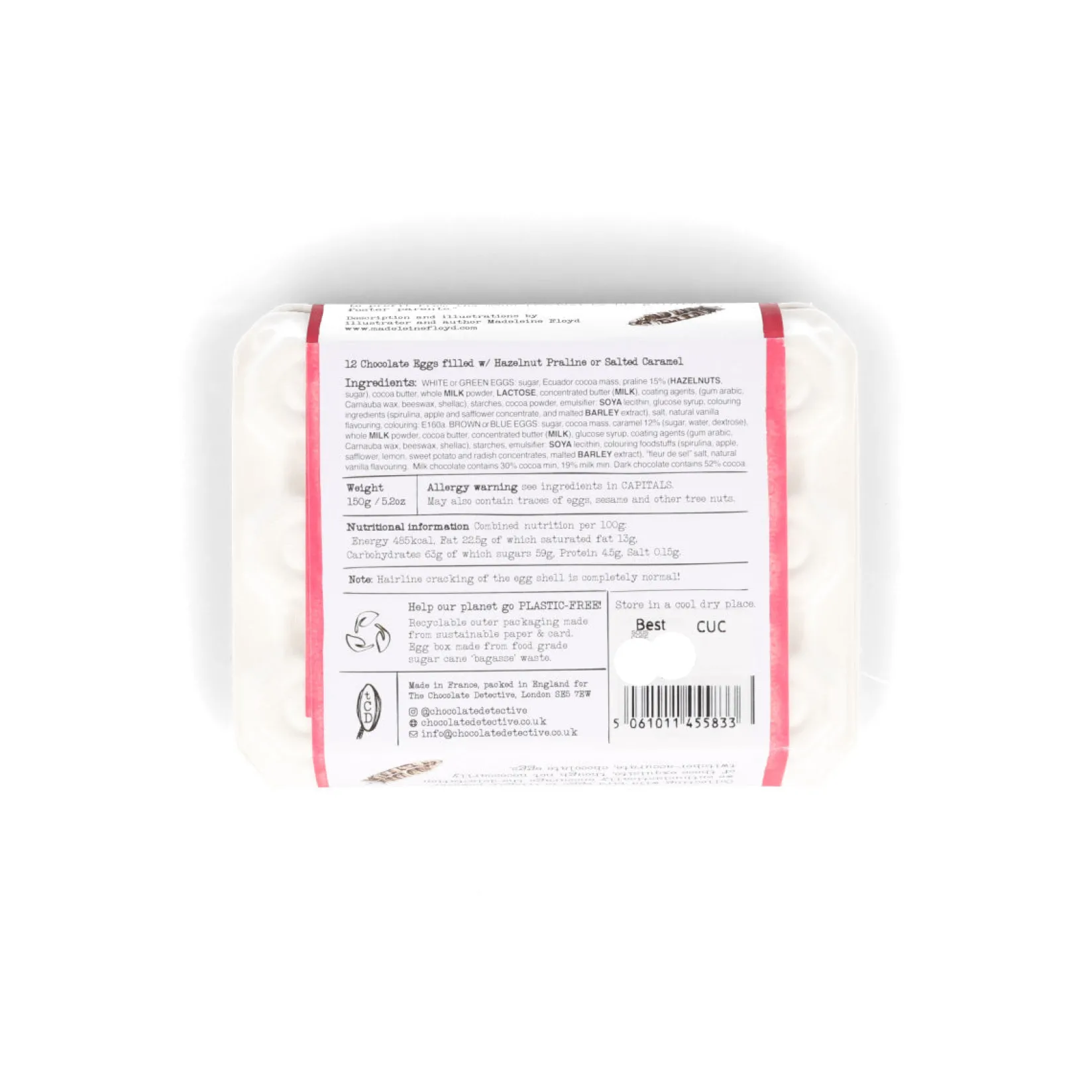Product formulations and details may change. For the latest ingredients and allergen information always check product packaging prior to consumption. Ingredients: white or green eggs: sugar, ecuador cocoa mass, praline 15% (hazelnuts, sugar), cocoa butter, whole milk powder, lactose, concentrated butter (milk), coating agents, (gum arabic, carnauba wax, beeswax, shellac), starches, cocoa powder, emulsifier: soya lecithin, glucose syrup, colouring ingredients (spirulina, apple and safflower concentrate, and malted barley extract), salt, natural vanilla flavouring, colouring: e160a. brown or blue eggs: sugar, ecuador cocoa mass, caramel 12% (sugar, water, dextrose), whole milk powder, cocoa butter, concentrated butter (milk), glucose syrup, coating agents (gum arabic, carnauba wax, beeswax, shellac), starches, emulsifier: soya lecithin, colouring foodstuffs (spirulina, apple, safflower, lemon, sweet potato and radish concentrates, malted barley extract), “fleur de sel” salt, natural vanilla flavouring. milk chocolate contains 30% cocoa min, 19% milk min. dark chocolate contains 52% cocoa.