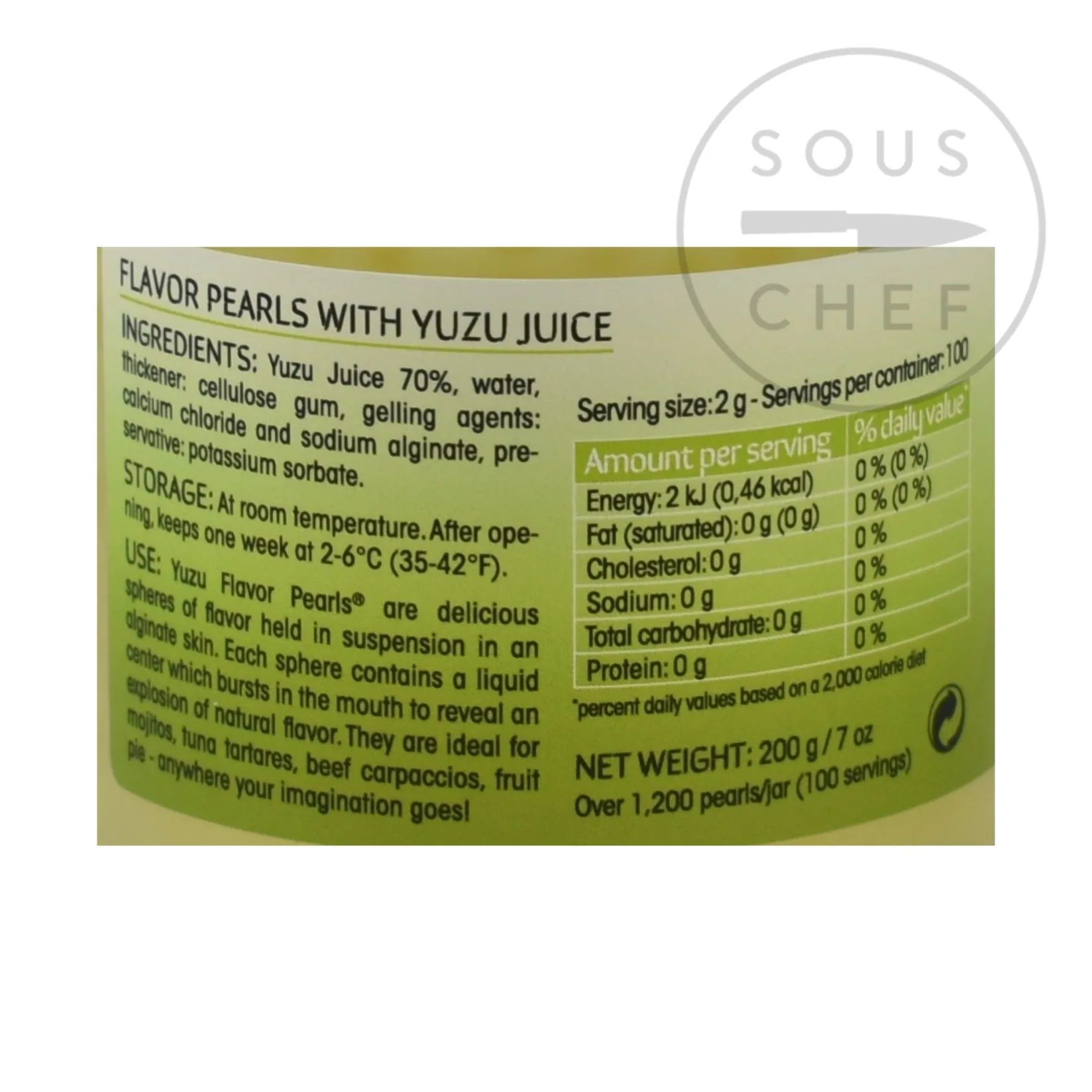 Product formulations and details may change. For the latest ingredients and allergen information always check product packaging prior to consumption. Ingredients: yuzu juice (70%), water, thickener: cellulose gum, firming agent: calcium chloride, gelling agent: sodium alginate.