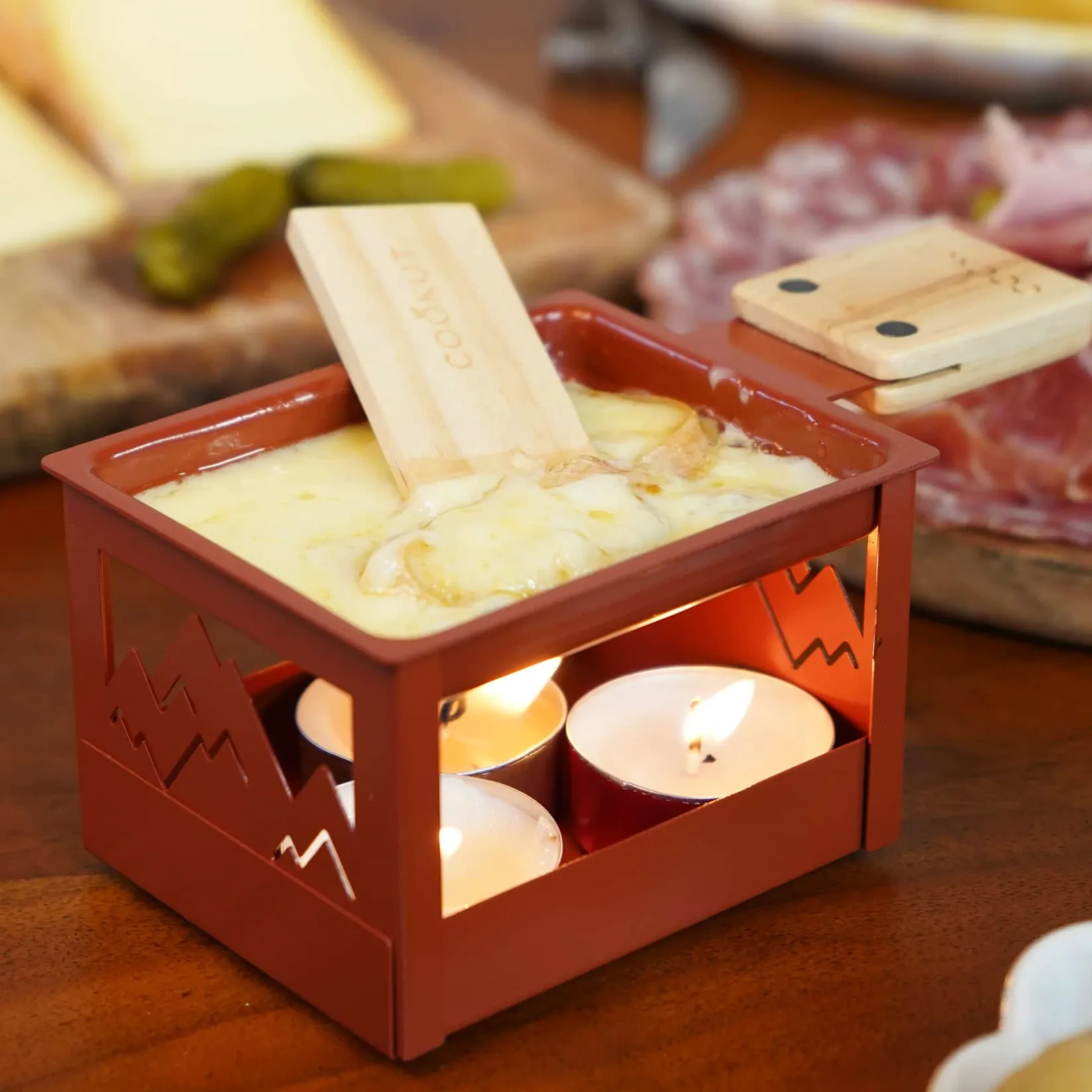 Place sliced cheese in the melting tray and light a candle underneath. The heat of the candle will melt the cheese in minutes. Use the wooden handle to pour it over boiled potatoes or crusty bread. If you can’t get raclette (a semi-hard Swiss cheese), you can use any cheese that melts easily.