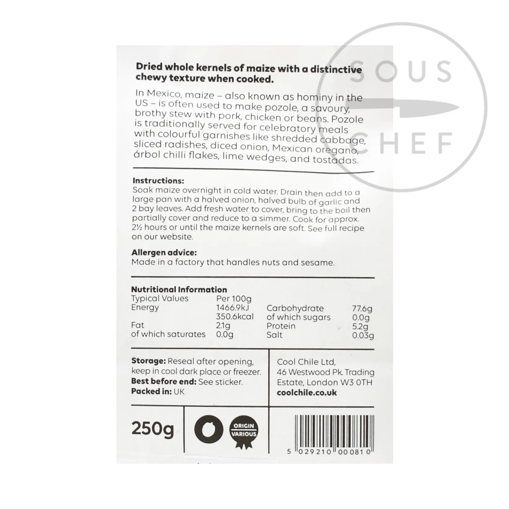 To prepare your maize for pozole, soak the kernels overnight in cold water. Drain then add to a large pan with a halved onion, halved bulb of garlic and 2 bay leaves. Add fresh water to cover, bring to the boil then partially cover and reduce to a simmer. Cook for approx. 2½ hours or until the maize kernels are soft.