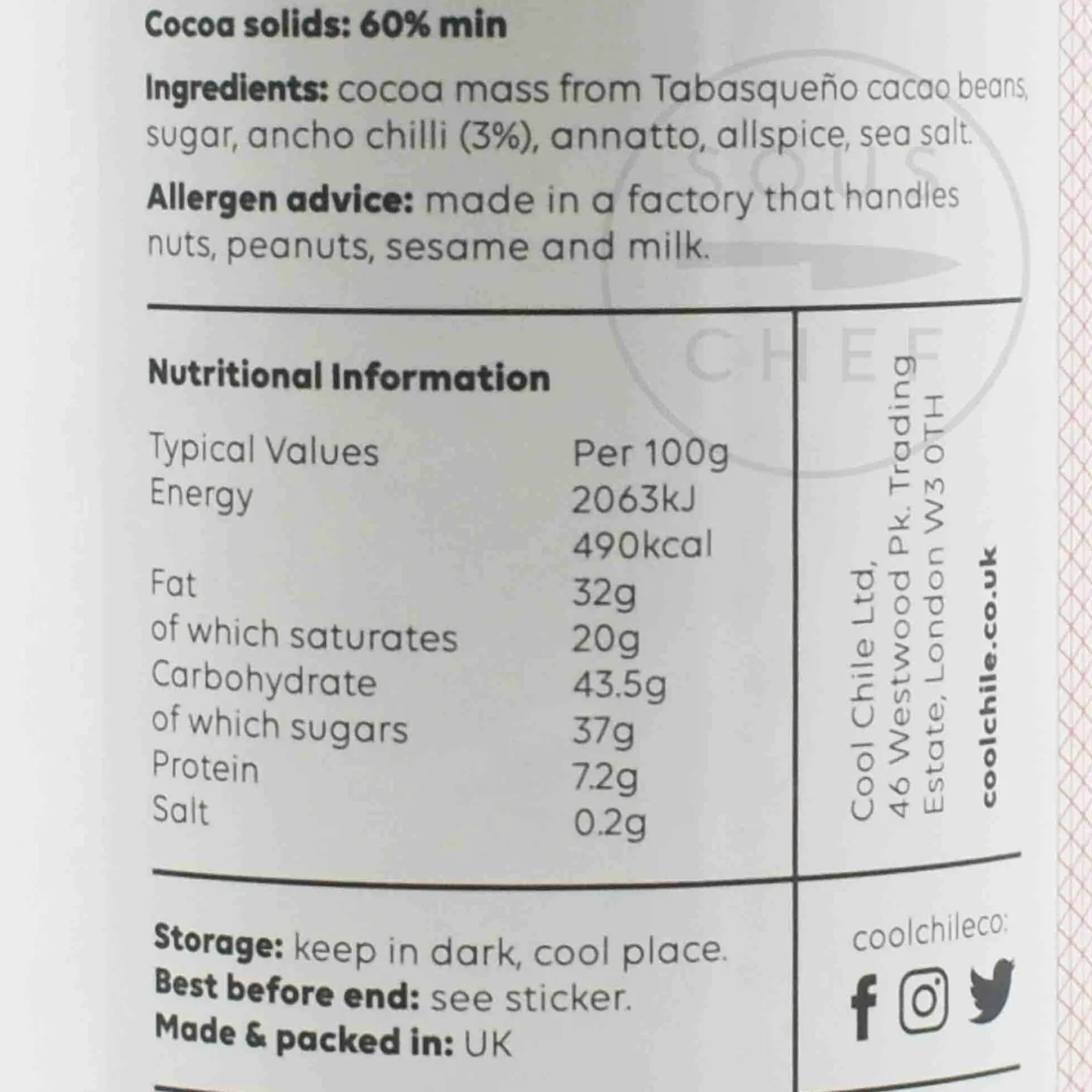 Product formulations and details may change. For the latest ingredients and allergen information always check product packaging prior to consumption. Ingredients: Cocoa mass from tabasqueño cacao beans, sugar, ancho chilli (3%), annatto, allspice, sea salt. min cocoa solids (60%)