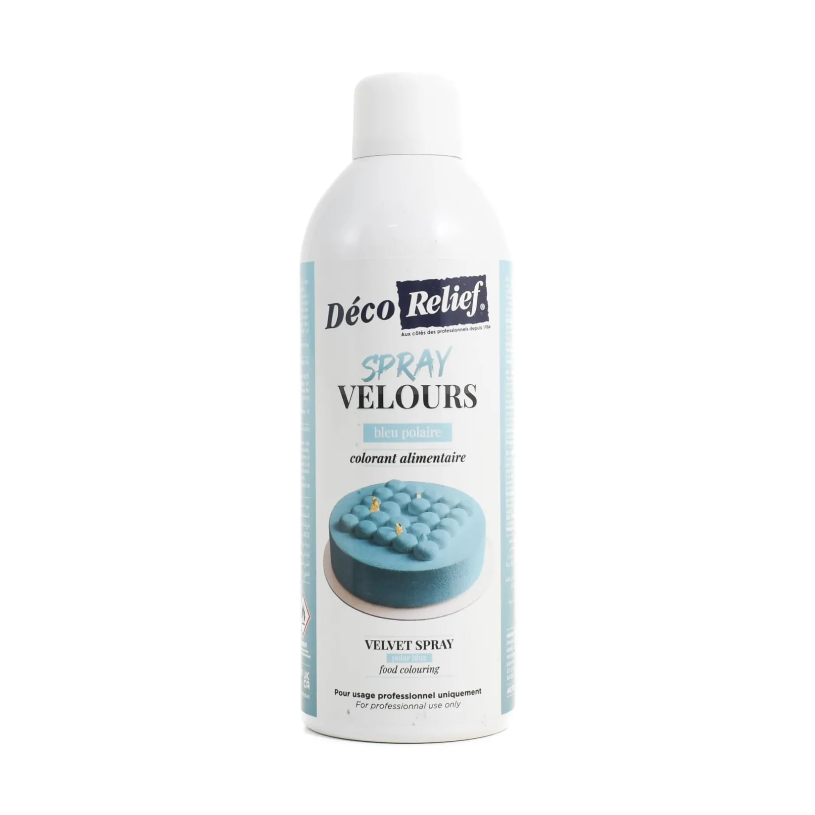 Transform cakes and desserts with Déco Relief polar blue velvet spray. It gives them a smooth, velvety finish that any pastry chef would be proud of. The deep blue colour is perfect for winter and under-the-sea themed bakes.