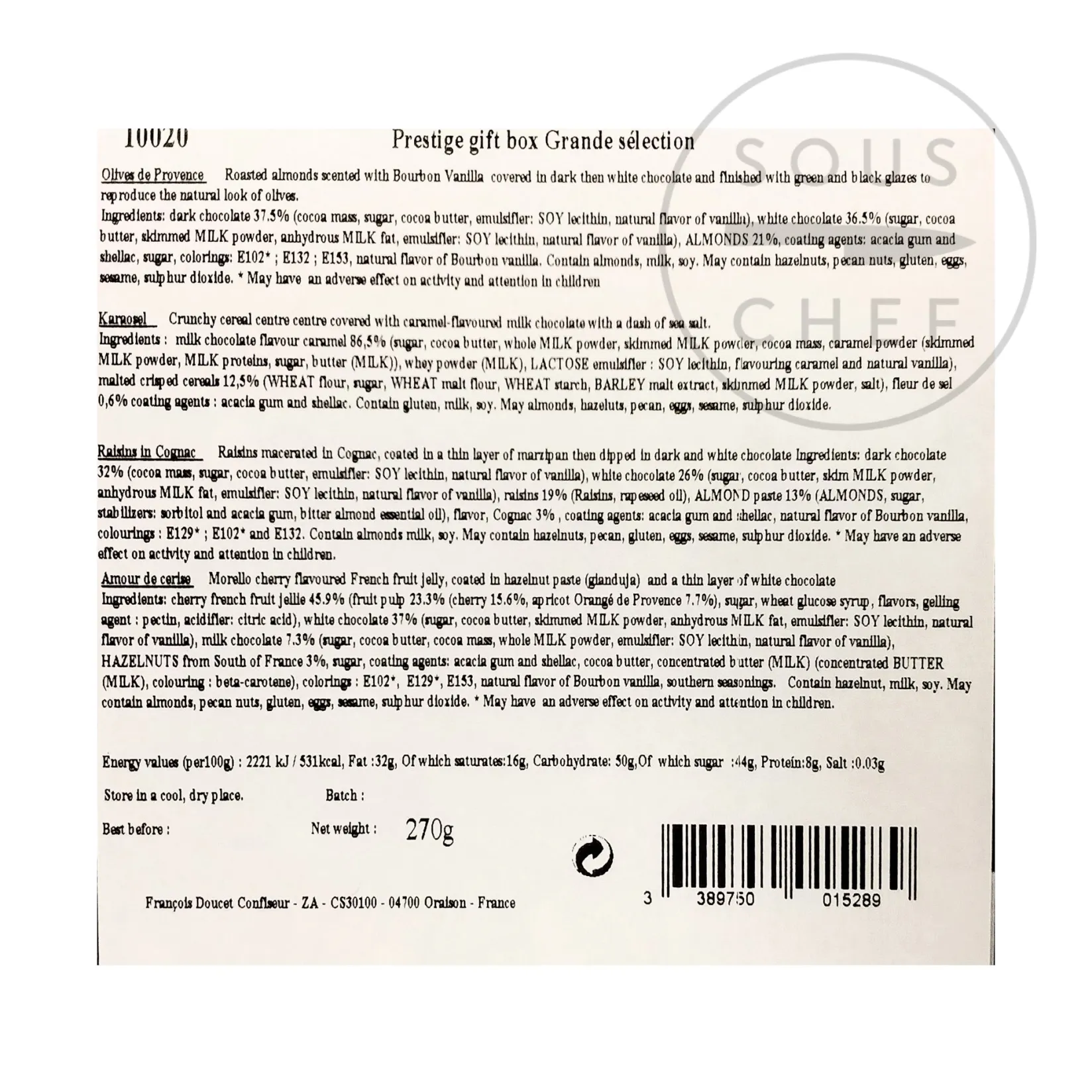 Product formulations and details may change. For the latest ingredients and allergen information always check product packaging prior to consumption. Ingredients: Olives of Provence: 37.5% Dark chocolate (cocoa paste, sugar, cocoa butter, emulsifier: soya lecithin, natural vanilla flavour), 36.5% white chocolate (sugar, cocoa butter, skimmed milk powder, anhydrous milk fat, emulsifier: soya lecithin, natural vanilla flavour), ALMONDS 21%, coating agents: acacia gum and shellac, sugar, colorants: E102 *; E132; E153, natural aroma of Bourbon vanilla. Cherry Love: 42.7% White chocolate (sugar, cocoa butter, skim milk powder, anhydrous milk fat, emulsifier: soya lecithin, natural vanilla flavour), cherry fruit paste 42.6% (fruit pulp 23 % (cherry 16%, apricot Orangé de Provence 7%), sugar, wheat glucose syrup, flavourings, gelling agent: pectin, acidifier: citric acid), milk chocolate 6.7% (sugar, cocoa butter, sugar paste) cocoa, MILK whole powder, emulsifier: soya lecithin, natural vanilla flavour), nuts from the South of France 3%, sugar, cocoa butter, coating agents: acacia gum and shellac, butter (milk) concentrated butter (milk) concentrate, colouring: beta-carotene), colouring: E102 *, E129 *, E153, natural Bourbon vanilla flavour, Provence herbs .Cognac Grapes: 32% Dark chocolate (cocoa mass, sugar, cocoa butter, emulsifier: soya lecithin, natural vanilla flavour), 26% white chocolate (sugar, cocoa butter, skimmed milk powder, anhydrous milk fat, emulsifier: soya lecithin, natural vanilla flavour), raisins 19% (grapes, rapeseed oil), almond paste 13% (almonds, sugar, stabilizers: sorbitol and acacia gum, bitter almond essential oil ), aroma, Cognac 3%, coating agents: acacia gum and shellac, natural Bourbon vanilla flavour, colors: E129 *; E102 *; E132. Karaosel: caramel flavoured milk chocolate 86.5% (sugar, cocoa butter, skimmed milk powder, cocoa mass, caramel powder (milk skimmed powder, milk protein, sugar, butter (milk )), whey in powder (milk ), lactose, emulsifier: soya lecithin, caramel flavour and natural vanilla), crumbly malted cereals 12.5% (BLE flour, sugar, malted wheat flour, BLE starch, barley malt extract, skim milk, salt), fleur de sel 0.6%, coating agents: acacia gum and shellac.