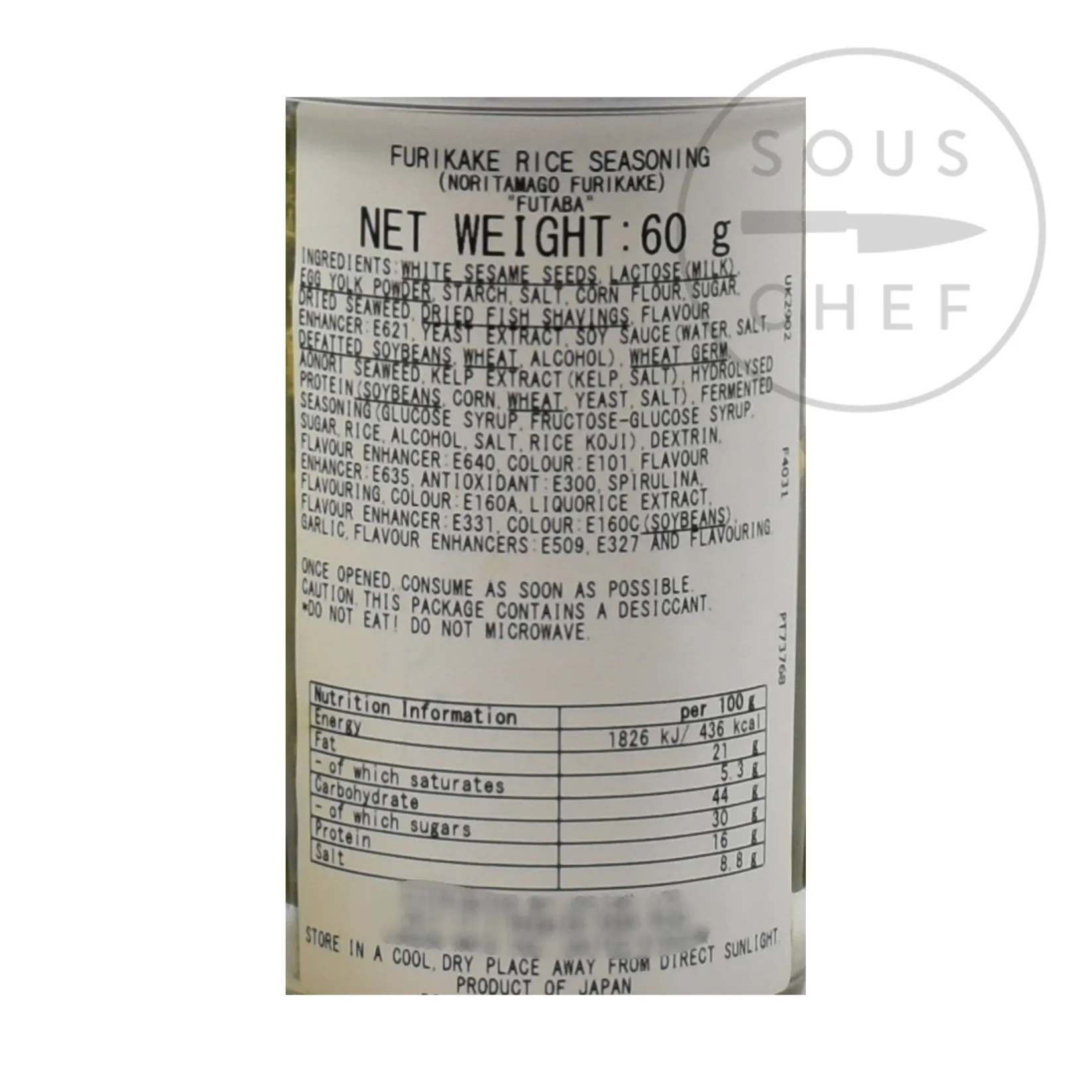 Product formulations and details may change. For the latest ingredients and allergen information always check product packaging prior to consumption. Ingredients: White sesame seed, lactose (milk), egg yolk powder, starch, salt, corn flour, sugar, dried seaweed, dried fish shavings, flavour enhancer: E621, yeast extract, soy sauce (water, salt, defatted soybeans, wheat, alcohol), wheat germ, aonori seaweed (green laver), kelp extract (kelp, salt), hydrolysed protein (soybeans, corn, wheat, yeast, salt), fermented seasoning (glucose syrup, fructose-glucose syrup, sugar, rice, alcohol, salt, rice koji), dextrin, flavour enhancer: E640, colour: E101, flavour enhancer:: E635, antioxidant: E300, spirulina, flavouring, colour: E160a, liquorice extract, flavour enhancer: E331, colour: E160c, garlic, flavour enhancers: E509, E327, flavouring. Contains allergens: sesame, milk, egg, fish, wheat, soy.