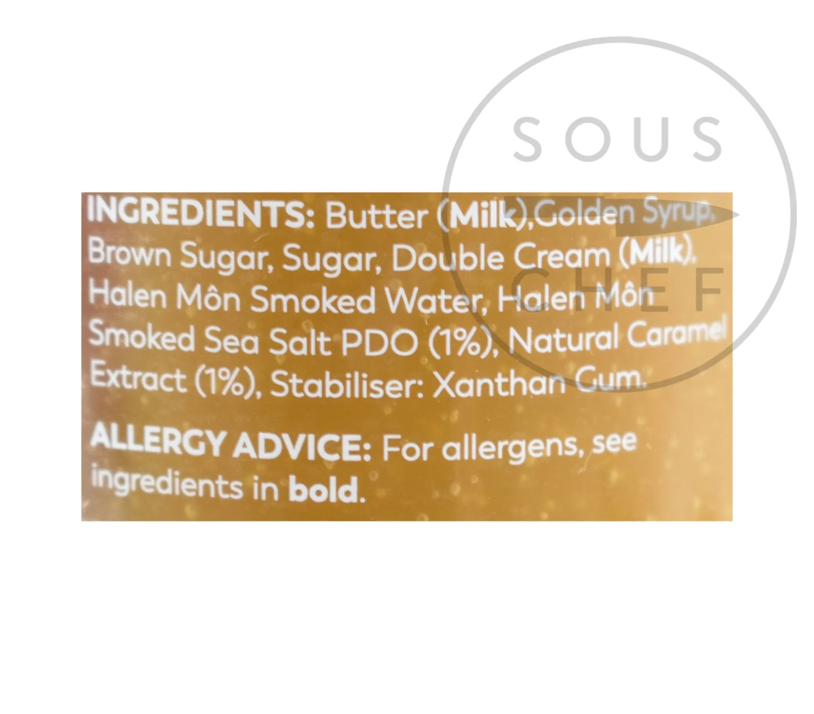 Product formulations and details may change. For the latest ingredients and allergen information always check product packaging prior to consumption. Ingredients: Butter (milk), golden syrup, brown sugar, sugar, double cream (milk), Halen Môn smoked water, Halen Môn smoked sea salt PDO (1%), natural caramel extract (1%), stabiliser: xanthan gum