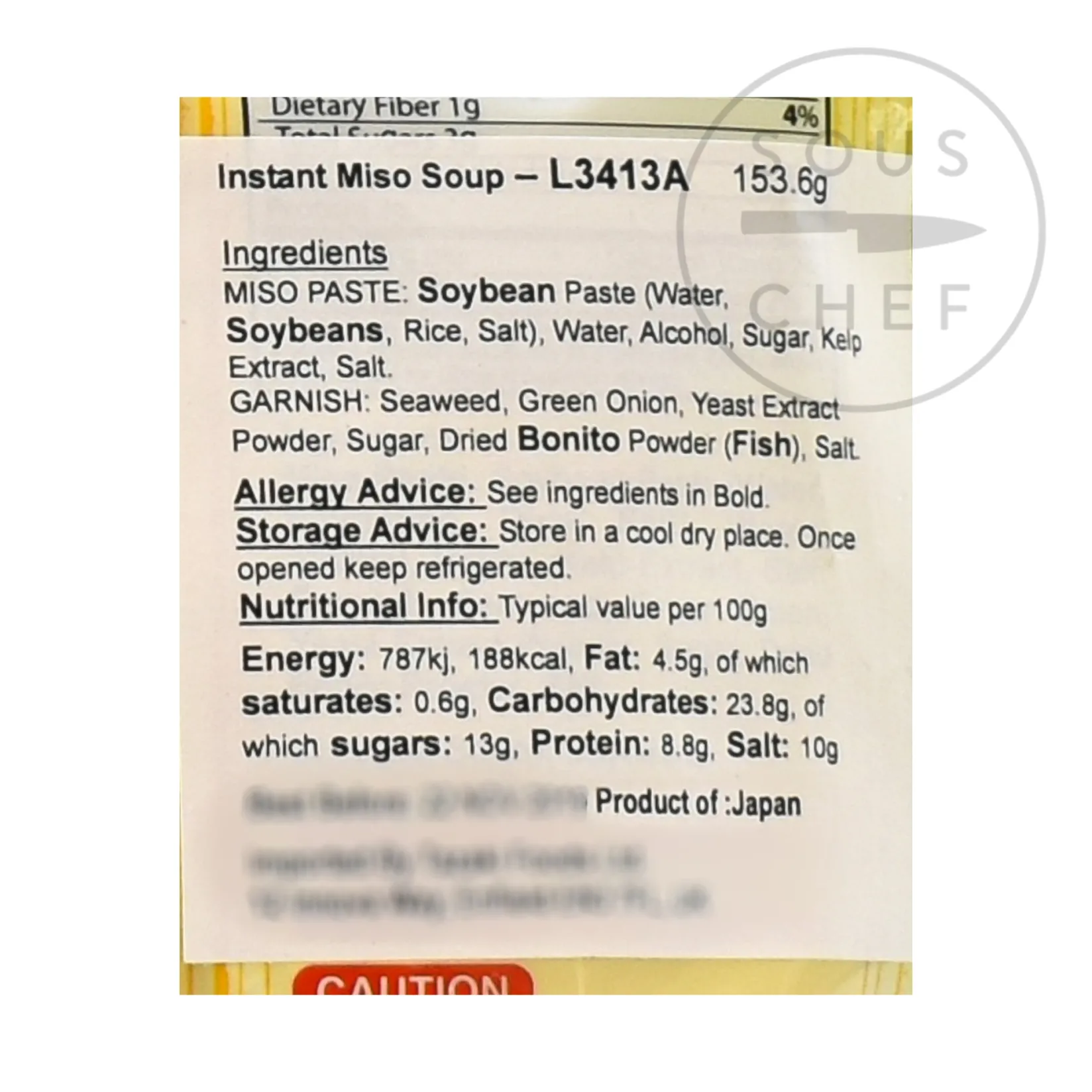 Product formulations and details may change. For the latest ingredients and allergen information always check product packaging prior to consumption. Ingredients: Soup Base soybean paste (soybean, rice, salt), water, alcohol, monosodium glutamate, bonito extract (fish), disodium inosinate Garnish seaweed, fried bean curd (soybean, soybean oil, palm oil, vitamin E, magnesium chloride), green onion, bonito extract granule (glucose, monosodium glutamate, salt, bonito powder, disodium inosinate, disodium guanylate, disodium succinate). Contains soya, fish.