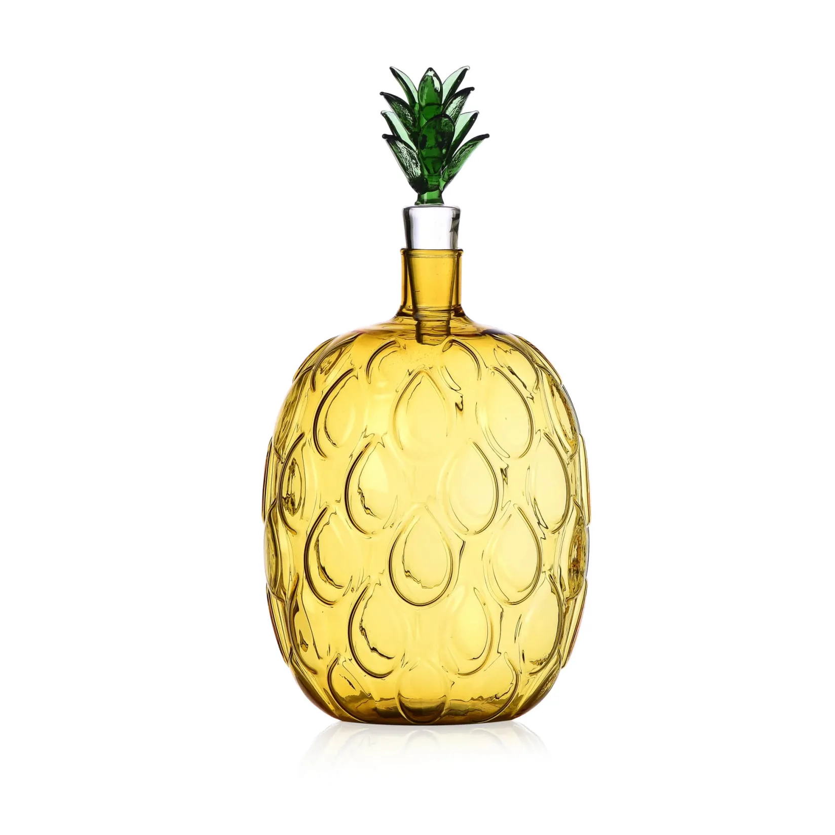 The rounded body has a textured appearance like pineapple skin. It’s topped with a green glass stopper that resembles the crown of a pineapple.