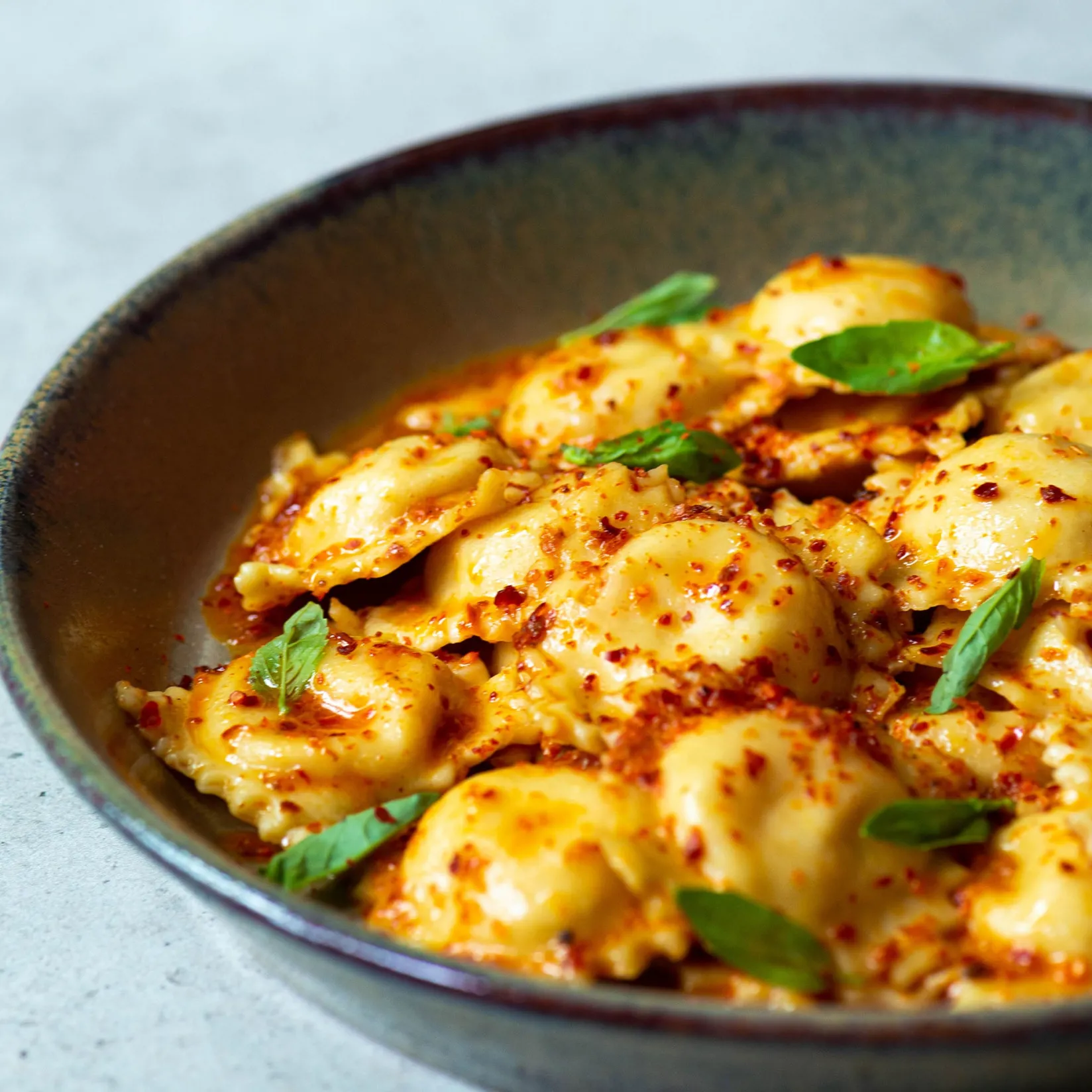 Lay down one sheet of pasta and gently press into the round indents. Fill the pasta with mushroom or goat’s cheese, lobster, pumpkin, or any other homemade filling – and then place another pasta sheet on top. Use the rolling pin to press together the parcels and and separate into individual ravioli.