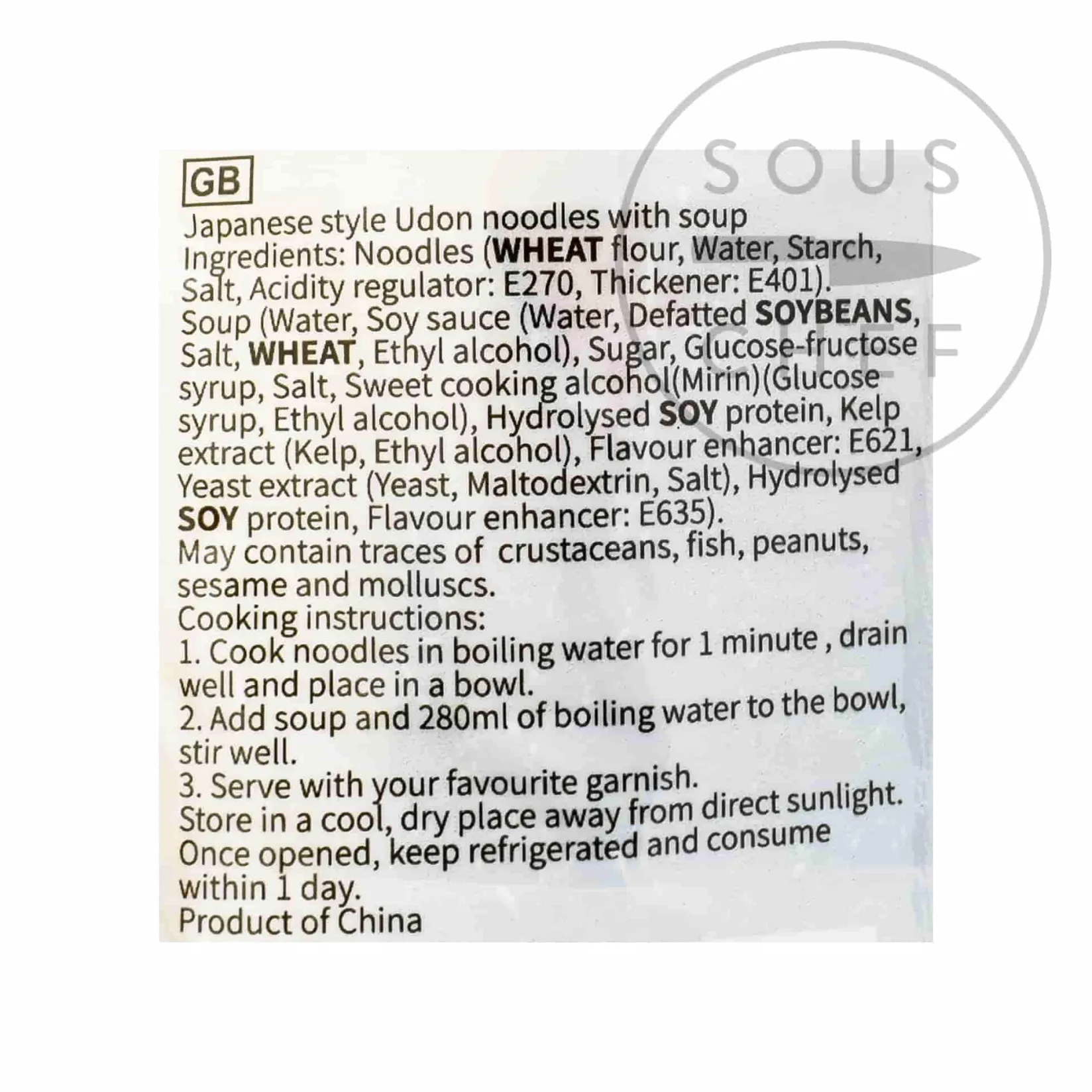 Product formulations and details may change. For the latest ingredients and allergen information always check product packaging prior to consumption. Ingredients: noodles (wheat flour, water, starch, salt, acidity regulator: E270, thickener: E401). soup (water, soy sauce (water, defatted soybeans, salt, wheat, ethyl alcohol), sugar, glucose-fructose syrup, salt, sweet cooking alcohol(mirin) (glucose syrup, ethyl alcohol), hydrolysed soy protein, kelp extract (kelp, ethyl alcohol), flavour enhancer: E621, yeast extract (yeast, maltodextrin, salt), hydrolysed soy protein, flavour enhancer: E635).