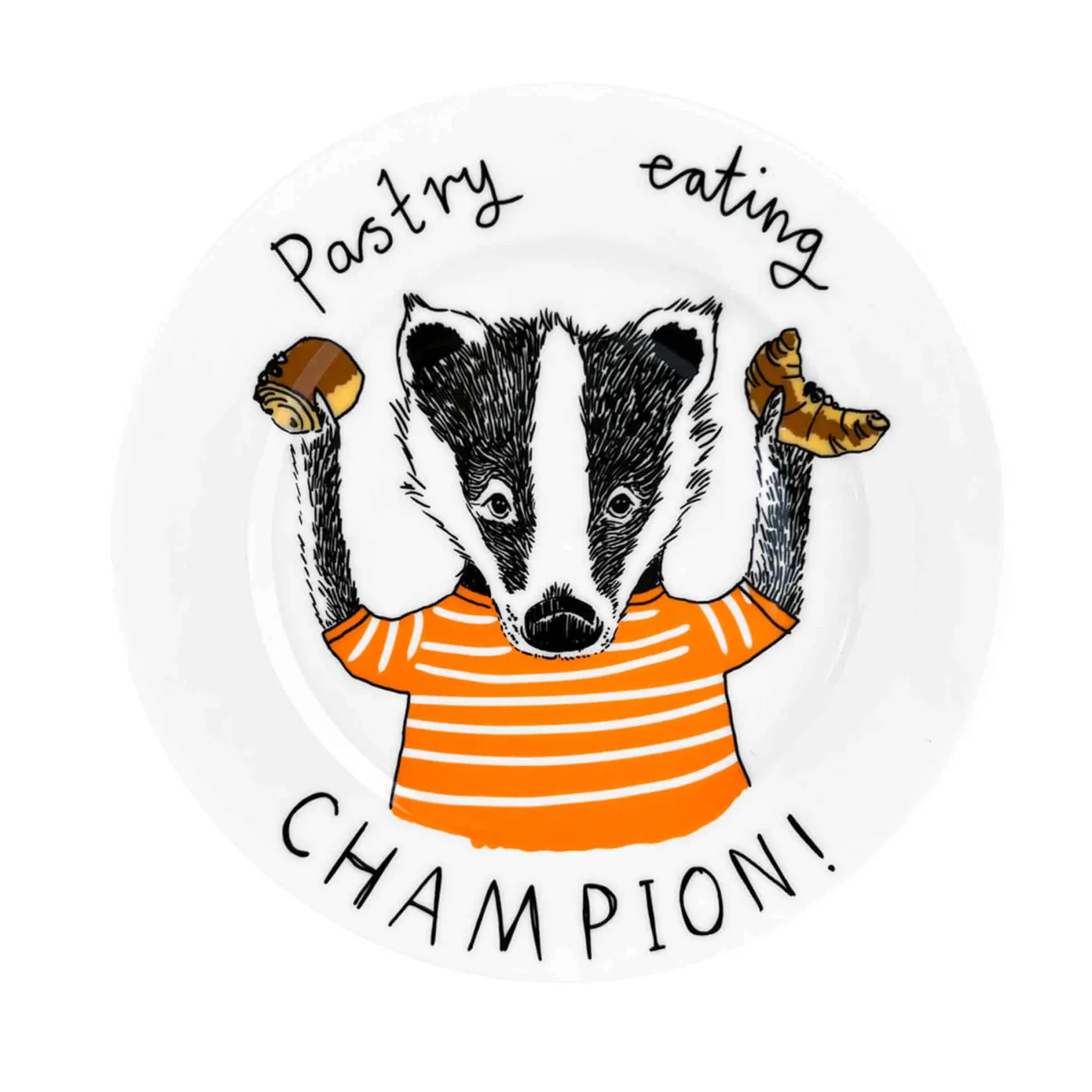 The side plate features our champion badger, with pastries in each hand, proudly celebrating the achievement. Each design is hand applied.