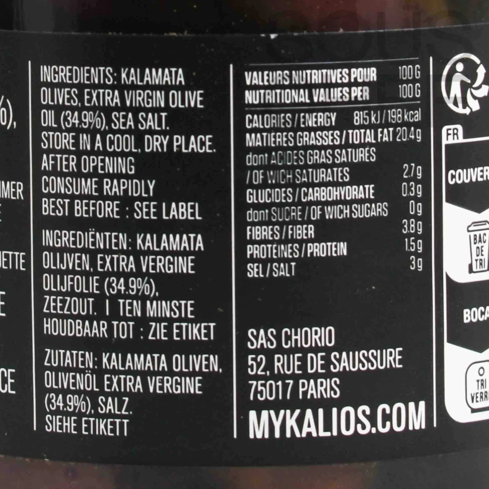 Product formulations and details may change. For the latest ingredients and allergen information always check product packaging prior to consumption. Ingredients: Kalamata olives (62,1%), extra virgin olive oil (32,2%), sea salt (5,7%)