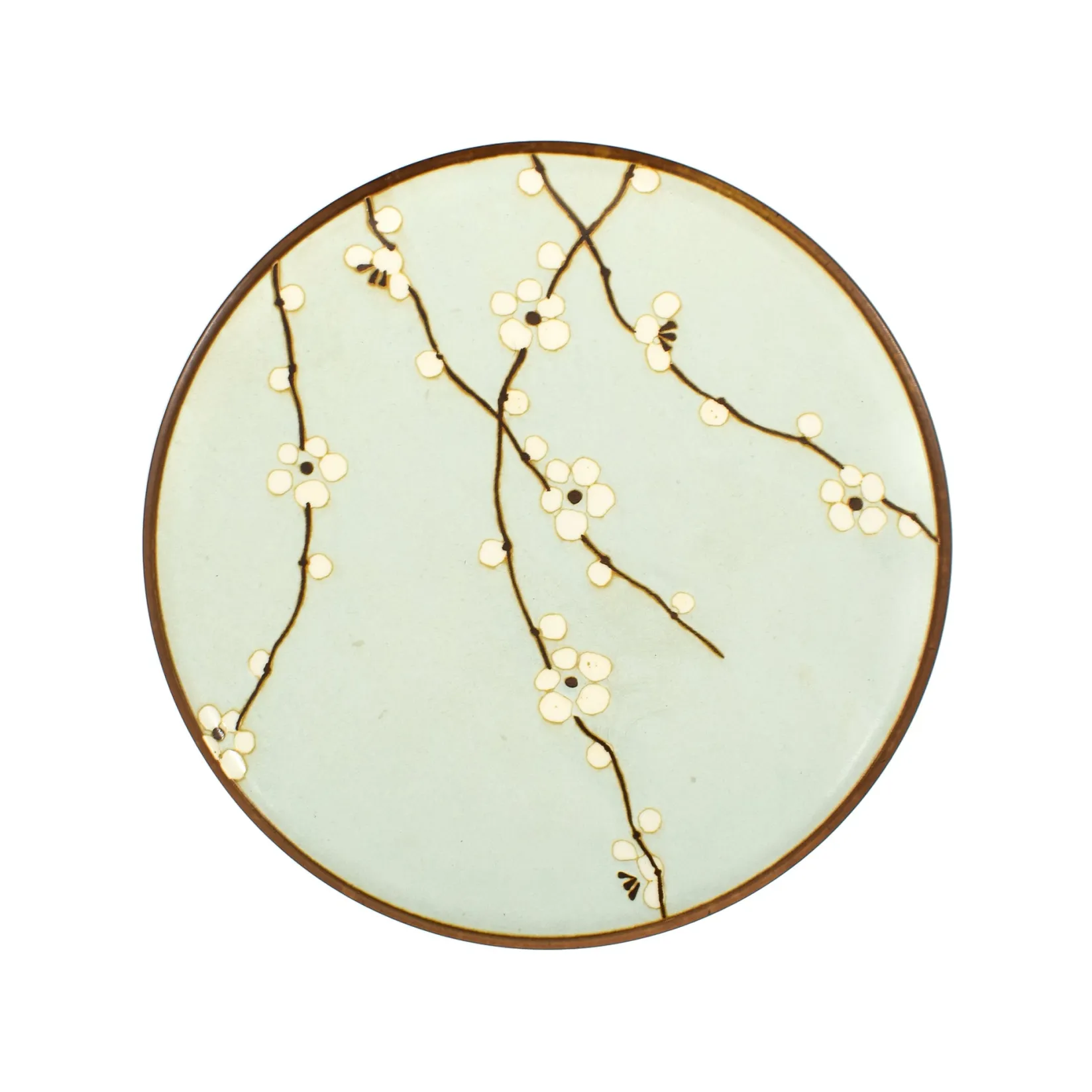 Attractive duck-egg blue stoneware plate decorated with a traditional Japanese sakura blossom pattern. The sakura blossom side plate is ideal for serving pickles and small salads as part of a spread of sharing dishes. Or use it for desserts such as yuzu panna cotta or sweet dumplings.