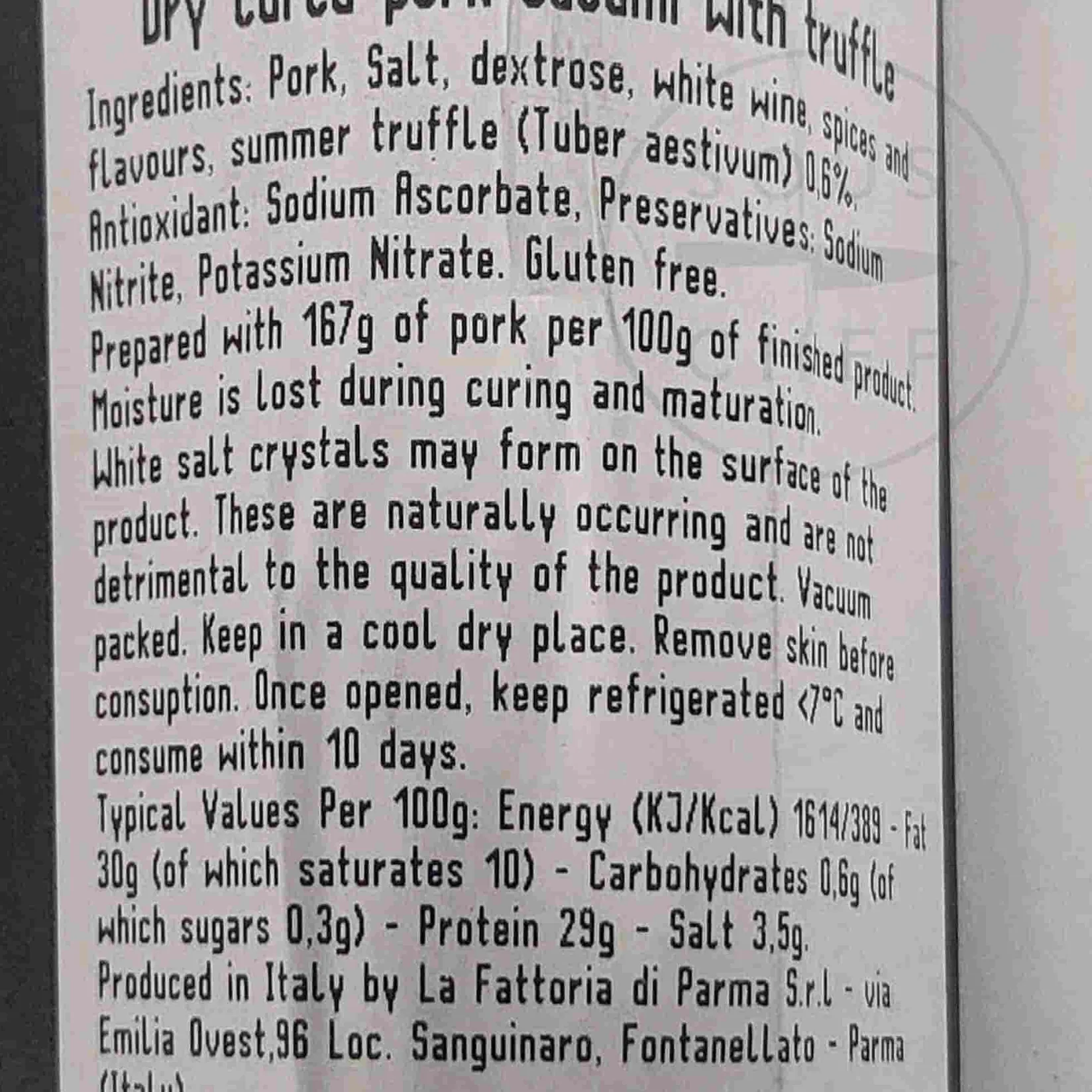 Product formulations and details may change. For the latest ingredients and allergen information always check product packaging prior to consumption. Ingredients: Pork meat, salt, dextrose, white wine, pepper, spices and natural flavours, summer truffle (tuber aestivum); antioxidant: e301, preservatives: e250-e252