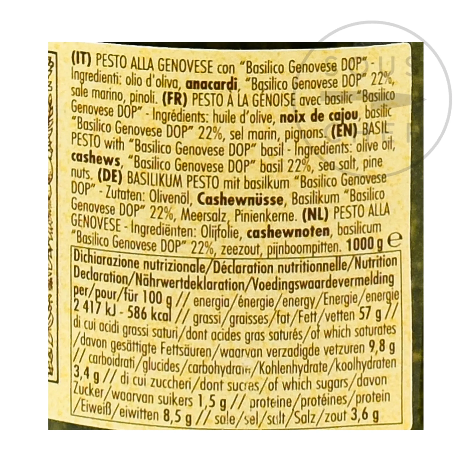 Product formulations and details may change. For the latest ingredients and allergen information always check product packaging prior to consumption. Ingredients: olive oil, cashews, ‘Basilico Genovese DOP’ basil (22%), sea salt, pine nuts. Contains allergens: nuts.