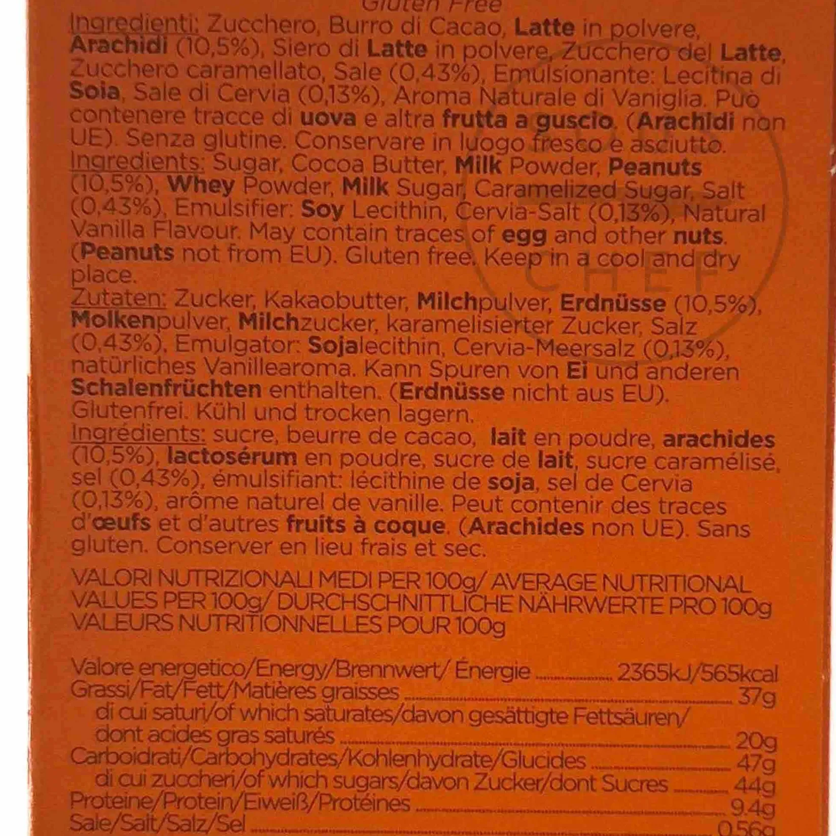 Product formulations and details may change. For the latest ingredients and allergen information always check product packaging prior to consumption. Ingredients: Sugar, cocoa butter, milk powder, peanuts (10,5%), whey powder, milk sugar, caramelized sugar (1.5%), salt (0.43%), emulsifier: soy lecithin, cervia-salt (0,13%), natural vanilla flavour.