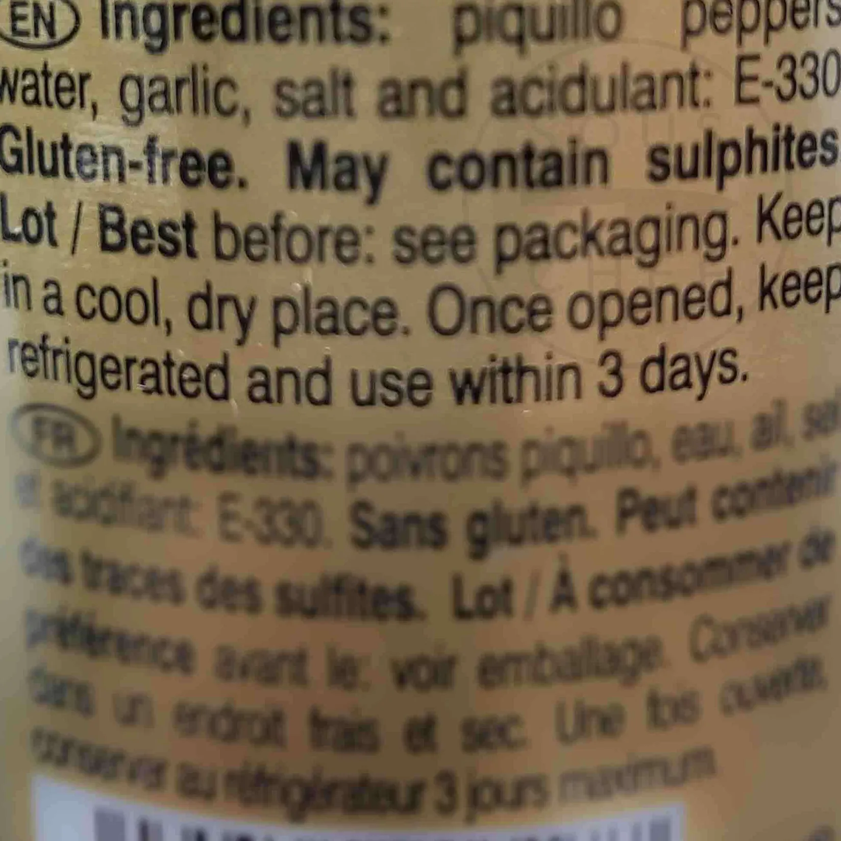 Product formulations and details may change. For the latest ingredients and allergen information always check product packaging prior to consumption. Ingredients: Piquillo peppers, water, garlic, salt and acidulant e330. May contain sulphites.