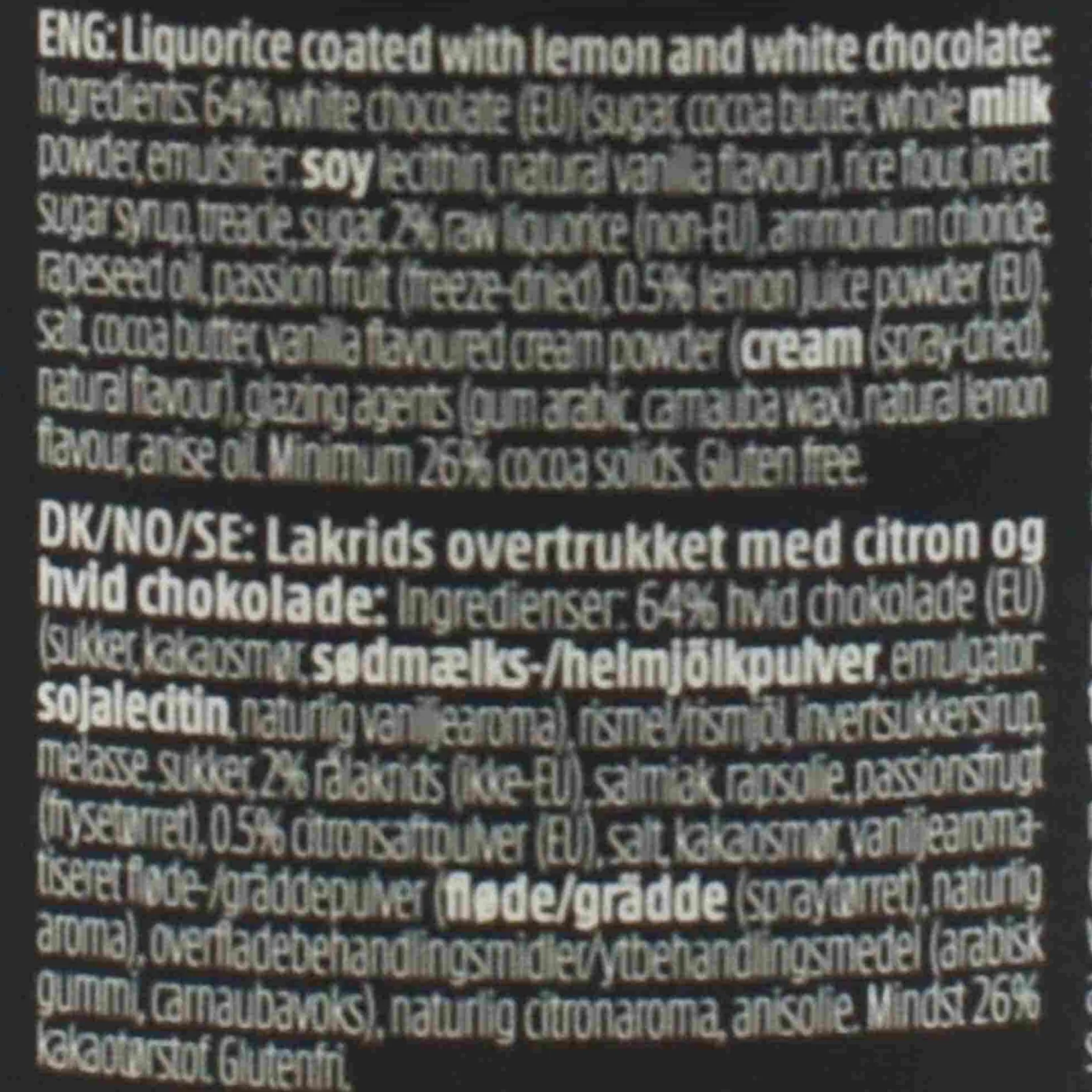 Product formulations and details may change. For the latest ingredients and allergen information always check product packaging prior to consumption. Ingredients: 64% white chocolate (eu) (sugar, cocoa butter, whole milk powder, emulsifier: soy lecithin, natural vanilla flavour), rice flour, invert sugar syrup, treacle, sugar, 2% raw liquorice (non-eu), ammonium chloride, rapeseed oil, passion fruit (freeze-dried), 0.5% lemon juice powder (eu), salt, cocoa butter, vanilla flavoured cream powder (cream (spray-dried), natural flavour), glazing agents (gum arabic, carnauba wax), natural lemon flavour, anise oil.