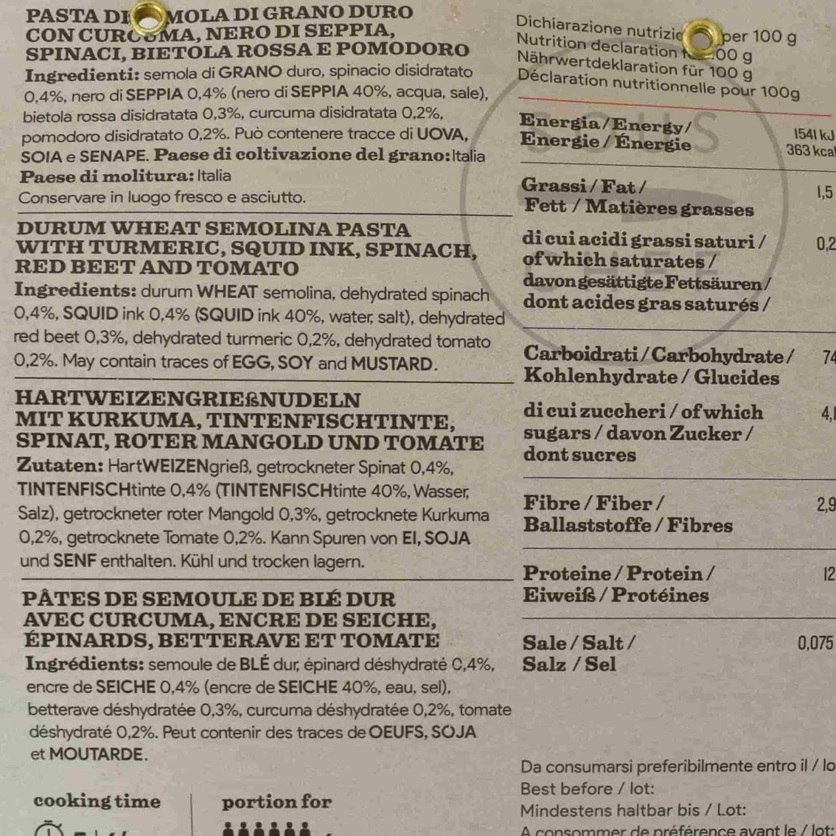 Product formulations and details may change. For the latest ingredients and allergen information always check product packaging prior to consumption. Ingredients: durum WHEAT semolina, dehydrated spinach 0,4%, SQUID ink 0,4% (SQUID ink 40%, water, salt), dehydrated red beet 0,3%, dehydrated turmeric 0,2%, dehydrated tomato 0,2%.”