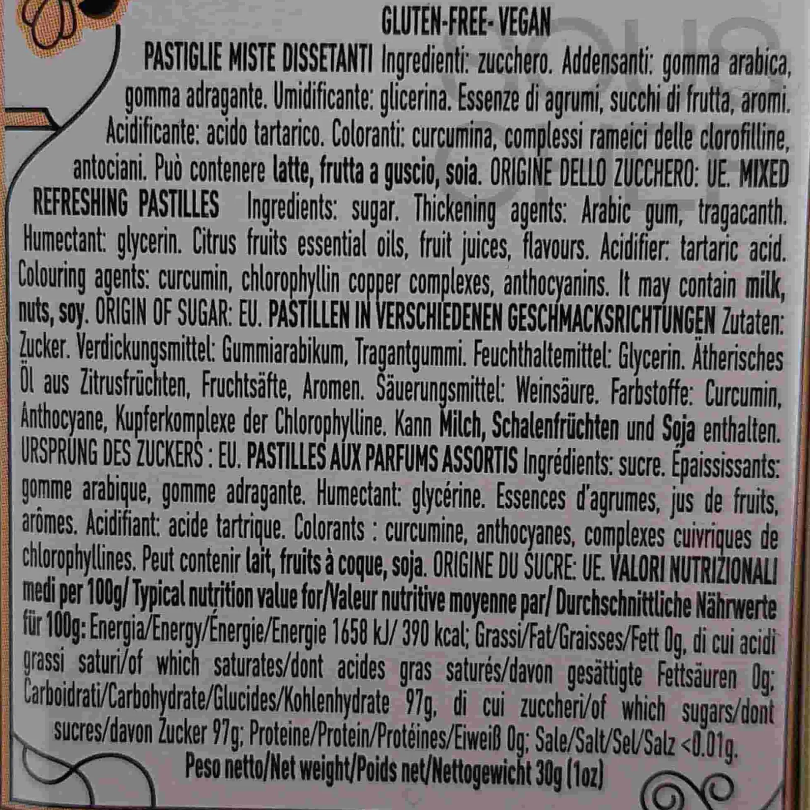Product formulations and details may change. For the latest ingredients and allergen information always check product packaging prior to consumption. Ingredients: Sugar. thickening agents: arabic gum, tragacanth. humectant : glycerin. citrus fruits essential oils, fruit juices, flavours. acidifier: tartaric acid. colourings: curcumin, chlorophyllin copper complexes, anthocyanins