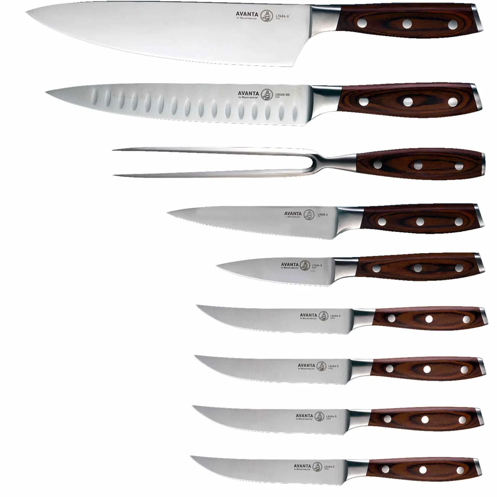 The Messermeister Avanta 10-piece knife block set features a selection of high-quality blades for mastering every kitchen task. From carving meat to chopping vegetables, slicing and dicing, this knife block set has you covered. The knife block set includes the following blades: