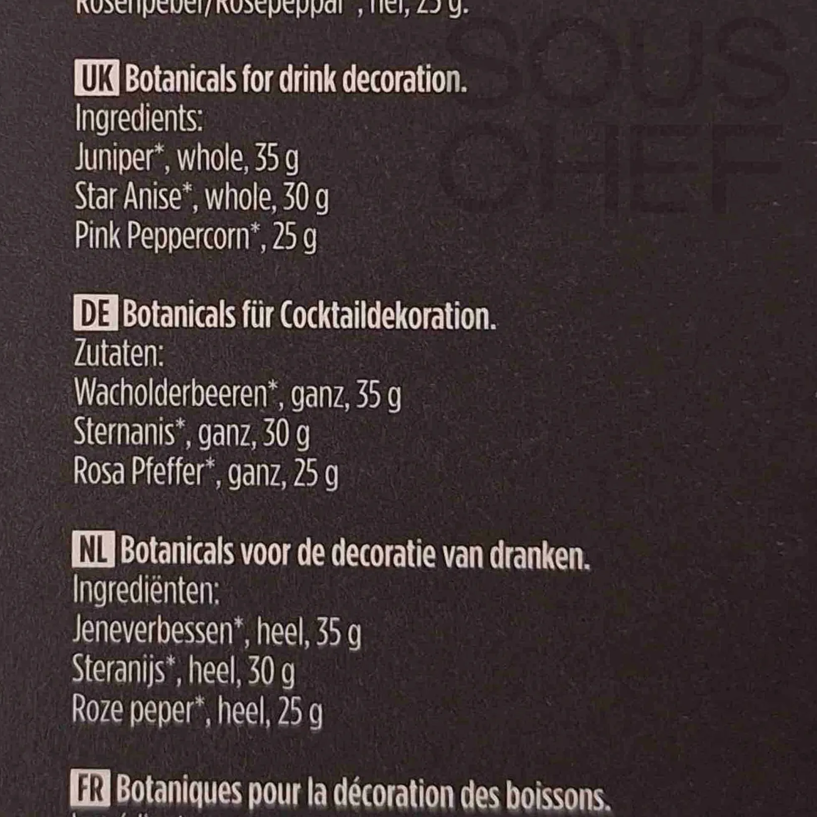Product formulations and details may change. For the latest ingredients and allergen information always check product packaging prior to consumption. Ingredients: Juniper, star anise (whole, star shaped), pink pepper berries peppercorn (non-eu non-eu non-eu)
