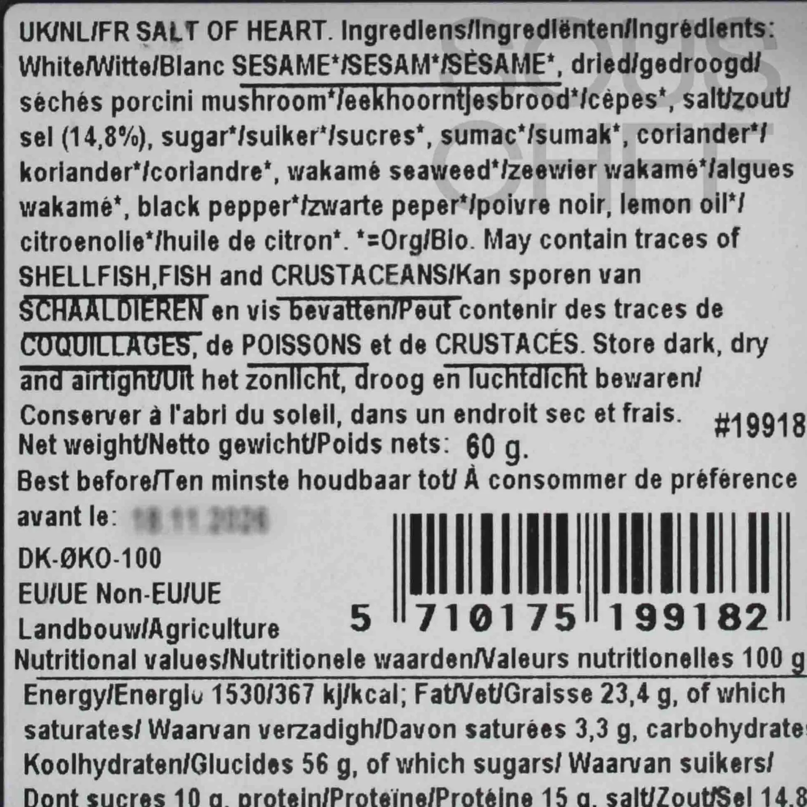 Product formulations and details may change. For the latest ingredients and allergen information always check product packaging prior to consumption. Ingredients: Salt (14.8%), white sesame * , dried porcini mushroom *, sugar *, sumac * coriander, lemon oil, winged kelp (seaweed) *, black pepper *