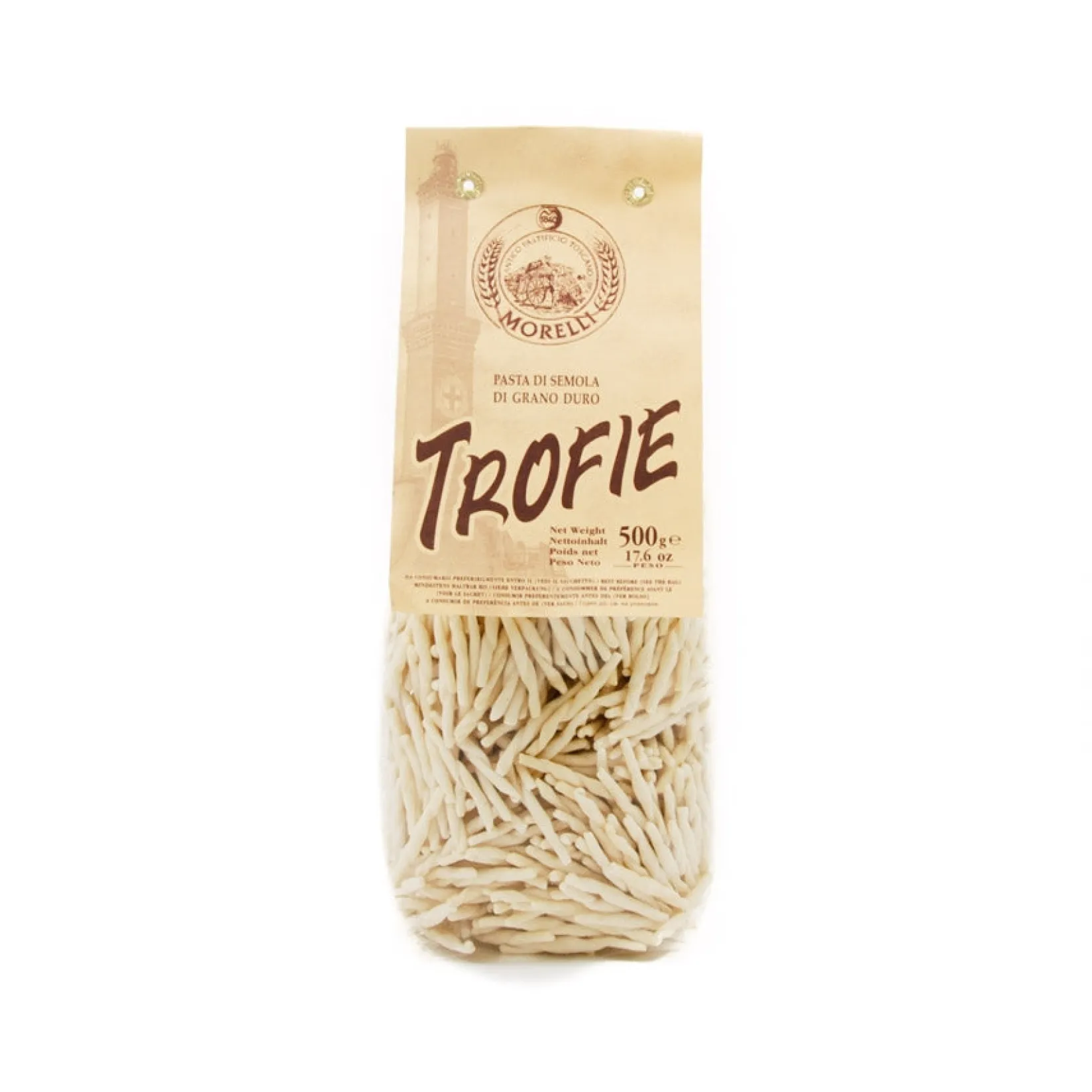 Morelli trofie pasta is a staple pasta shape in Ligurian cuisine. The most popular way to serve the short, twisted strands of pasta is with traditional Genovese basil pesto.
