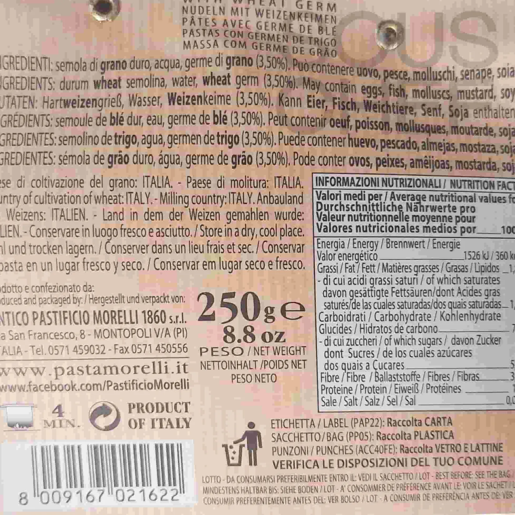 Morelli uses an artisan method of reincorporating wheat germ into semolina. It gives their pasta a unique flavour and aroma, similar to toasted wheat.