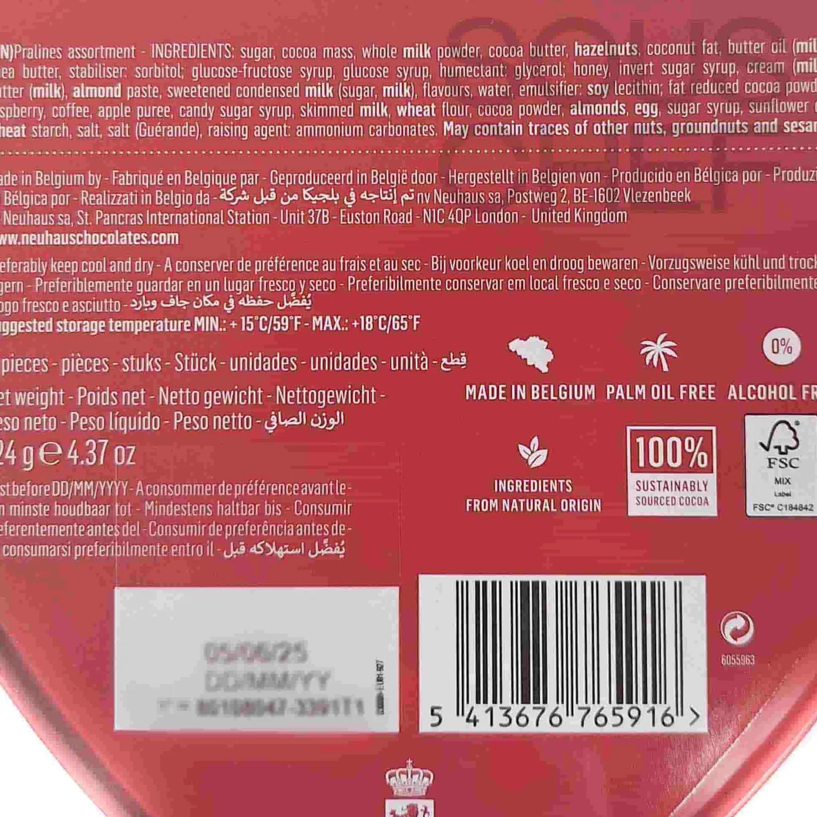 Product formulations and details may change. For the latest ingredients and allergen information always check product packaging prior to consumption. Ingredients: sugar, cocoa mass, whole milk powder, cocoa butter, hazelnuts, coconut fat, butter oil (milk), shea butter, stabiliser: sorbitol; glucose-fructose syrup, glucose syrup, humectant: glycerol; honey, invert sugar syrup, cream (milk), butter (milk), almond paste, sweetened condensed (sugar, milk), flavours, water, emulsifier: soy lecithin; fat reduced cocoa powder, raspberry, coffee, apple puree, candy sugar syrup, skimmed milk, wheat flour, cocoa powder, almonds, egg, sugar syrup, sunflower oil, wheat starch, salt, salt (Guérande), raising agent: ammonium carbonates.