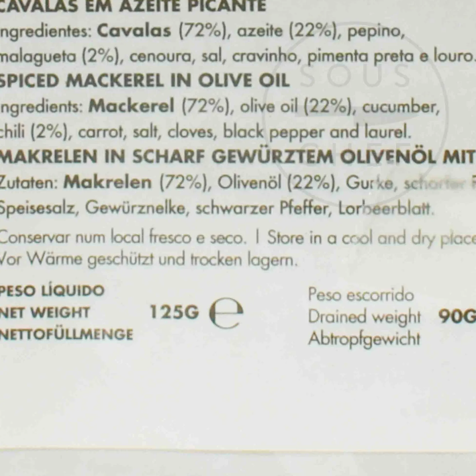 Product formulations and details may change. For the latest ingredients and allergen information always check product packaging prior to consumption. Ingredients: Mackerel (72%), olive oil (22%), cucumber, chilli (2%), carrot, salt, cloves, black pepper and laurel