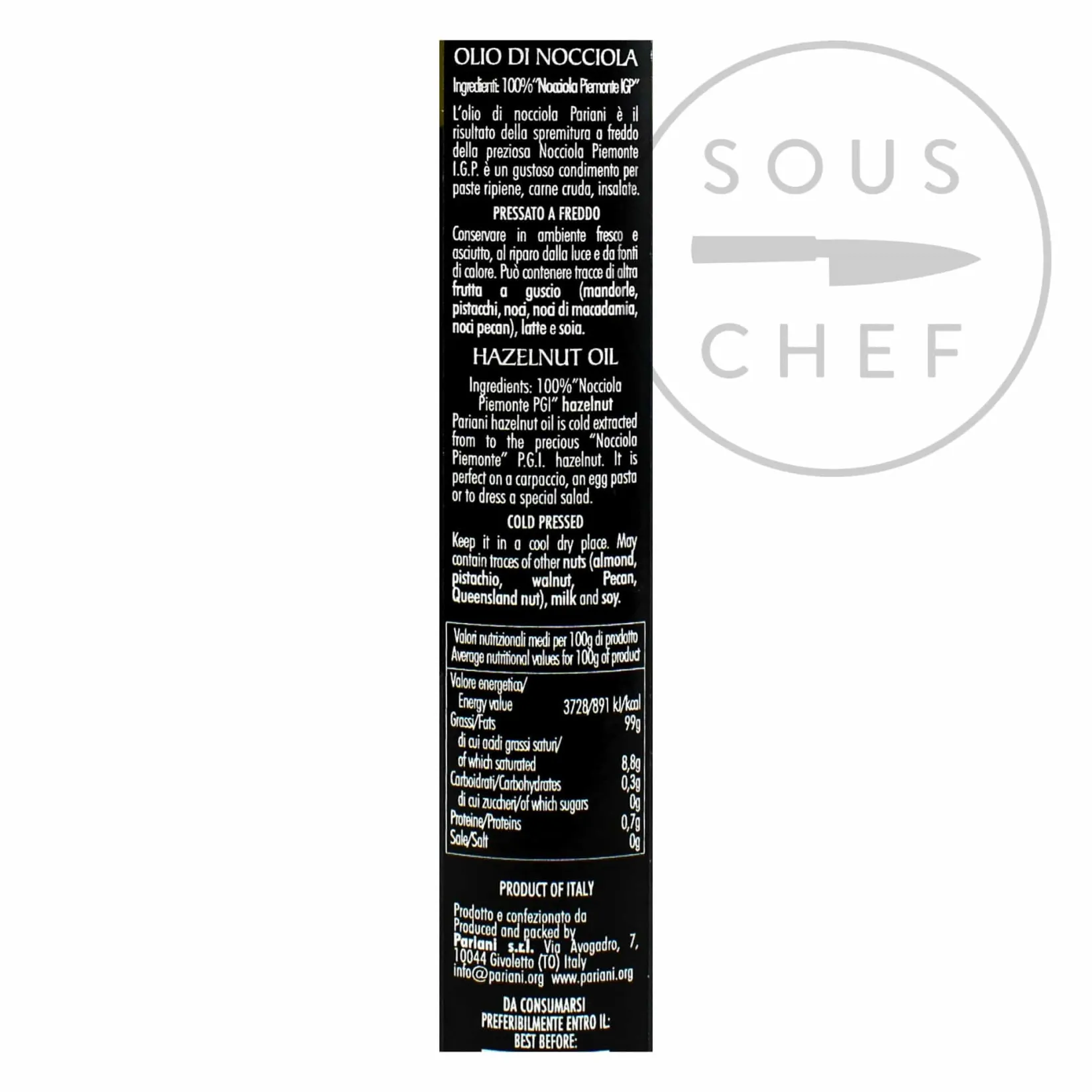 Pariani’s hazelnut oil is made with one of the world’s finest varieties of hazelnut – Piemonte IGP. The hazelnuts grow in the field of Langhe, a hilly area in northwest Italy. The nuts have been cold pressed without chemical additives, then filtered, producing an intense flavour.