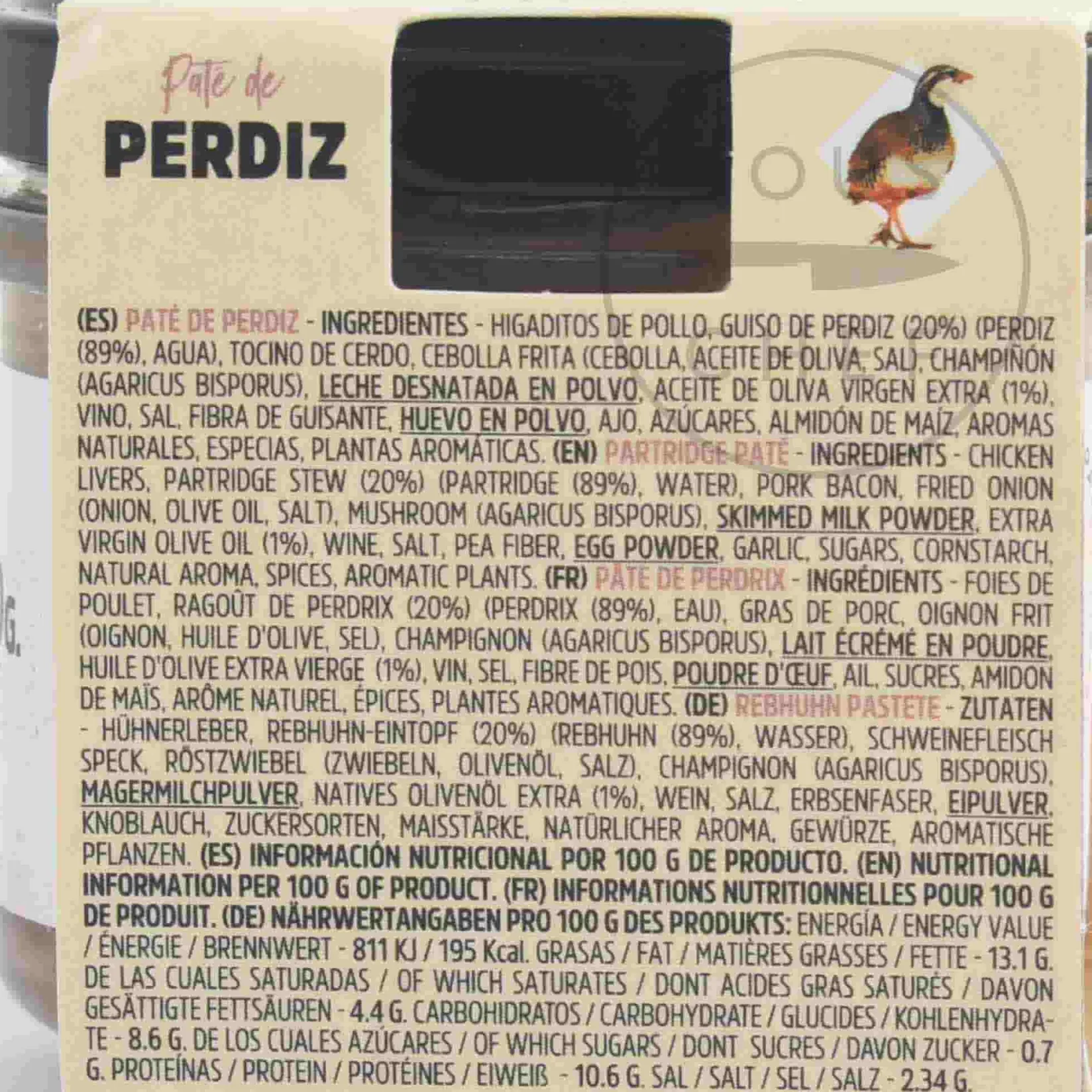 Product formulations and details may change. For the latest ingredients and allergen information always check product packaging prior to consumption. Ingredients: Chicken livers, partridge stew (20%) (partridge (89%), water), pork bacon, fried onion (onion, olive oil, salt), mushroom (agaricus bisporus), skimmed milk powder, extra virgin olive oil (1%), wine, salt, pea fiber, egg powder, garlic, sugars, cornstarch, natural aroma, spices, aromatic plants.