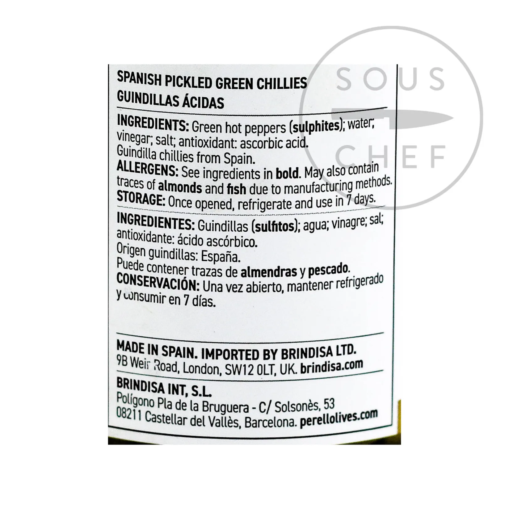 Product formulations and details may change. For the latest ingredients and allergen information always check product packaging prior to consumption. Ingredients: Green hot peppers (sulphites); water; vinegar; salt; antioxidant: ascorbic acid.