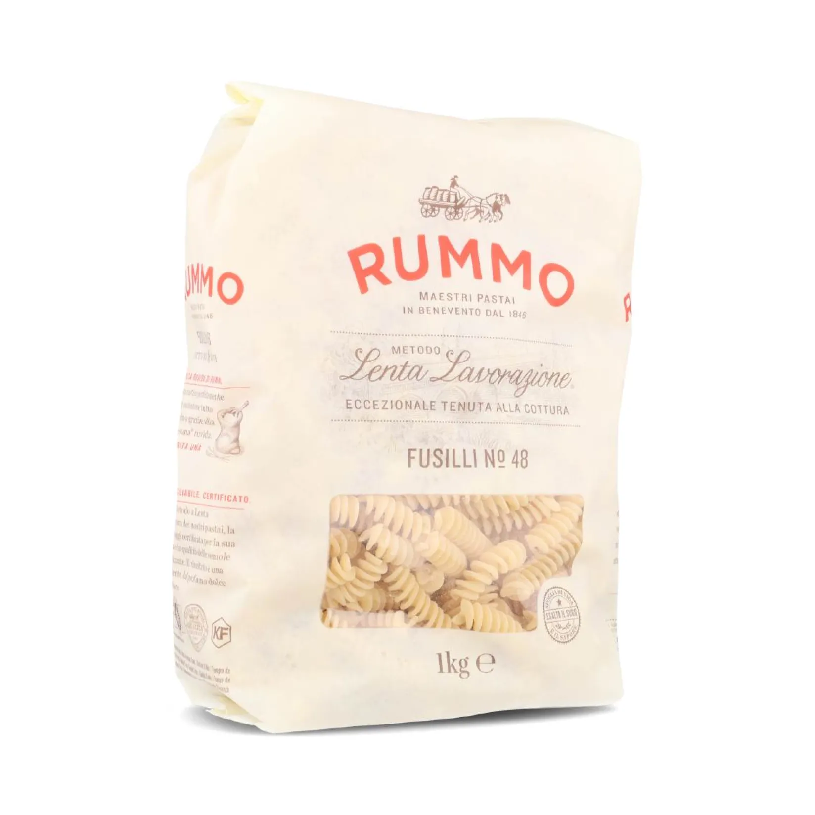 Rummo fusilli no. 48 is a classic spiral pasta shape. The surface of the bronze-die extruded durum wheat fusilli pasta will cling to your sauce. Rummo fusilli pasta cooks in 9 minutes.
