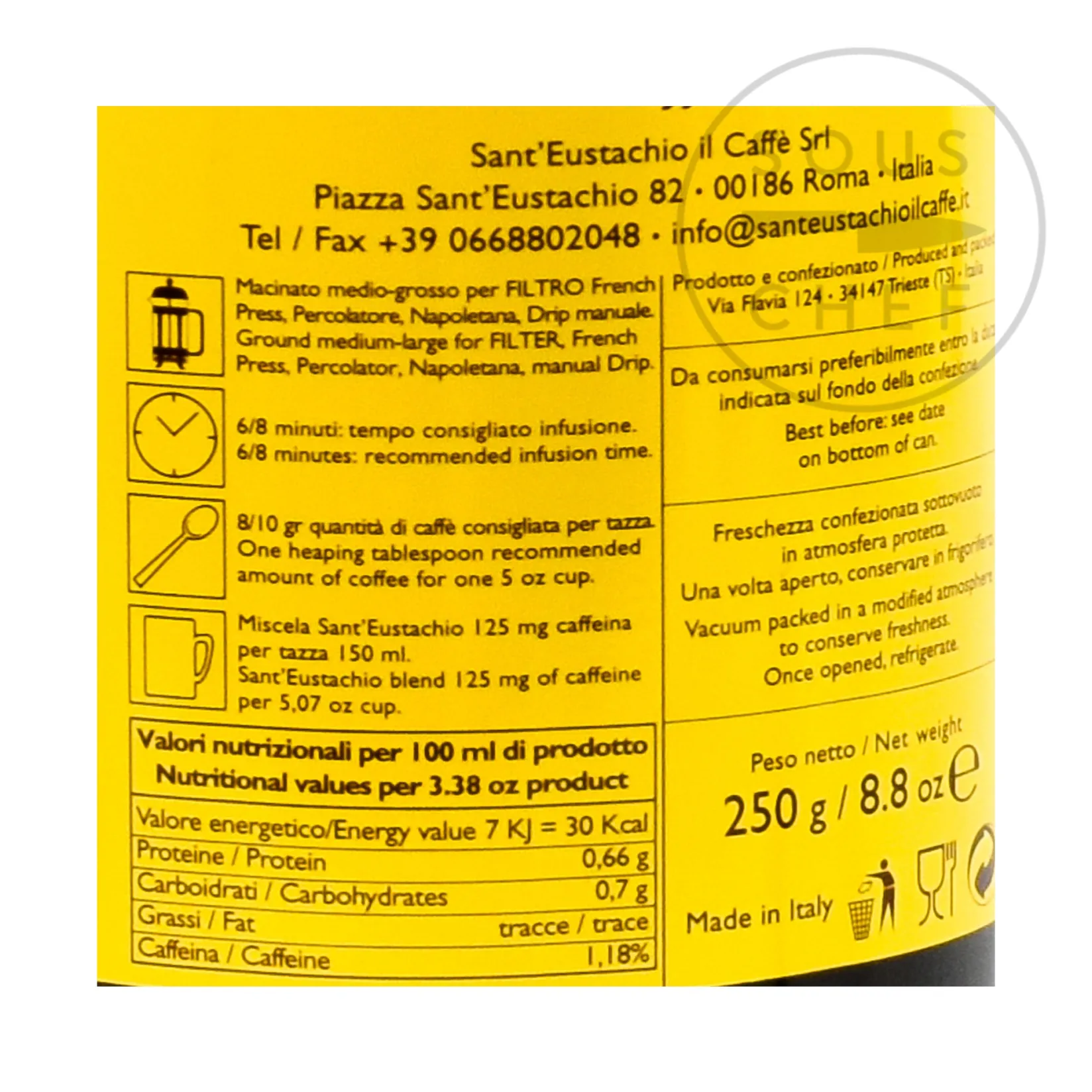 Use the Sant’Eustachio coffee blend ground for filters to make every coffee extra special. This secret blend of 100% Arabica, wood roasted coffee beans is particularly desirable for making the perfect Italian espresso or cappuccino. The medium-large size of the coffee grounds is ideal for coffee filters, percolators or cafetières.