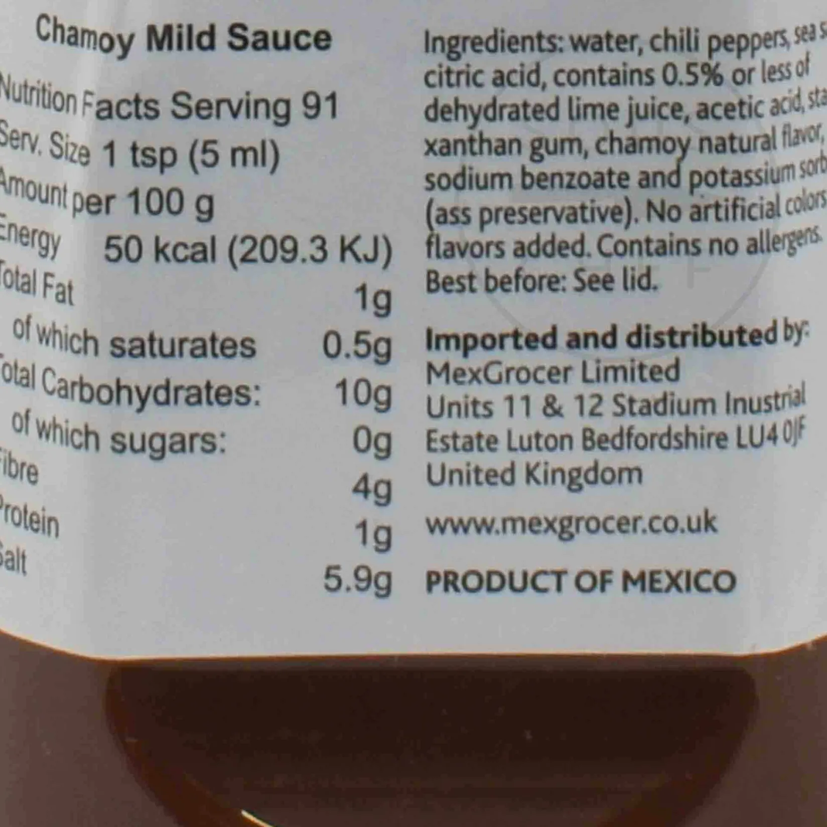 Product formulations and details may change. For the latest ingredients and allergen information always check product packaging prior to consumption. Ingredients: Water, chilli peppers, iodized sea salt, citric acid, dehydrated lime juice, acetic acid, starch, xanthan gum, chamoy flavour, 0.1% sodium benzoate (preservative) potassium sorbate. no artificial colours or flavours added.