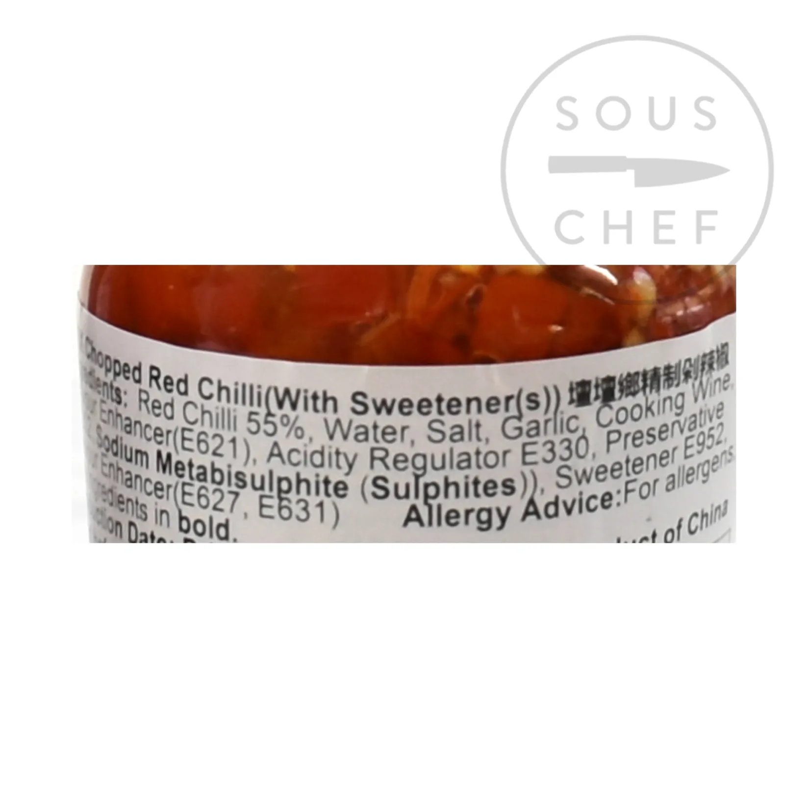 Product formulations and details may change. For the latest ingredients and allergen information always check product packaging prior to consumption. Ingredients: Red chilli 55%, water, salt, garlic, cooking wine, flavour enhancer (E621, E627, E631), preservative (E202, E223), sweetener E952, acidity regulator E330. Contains sodium metabisulphite