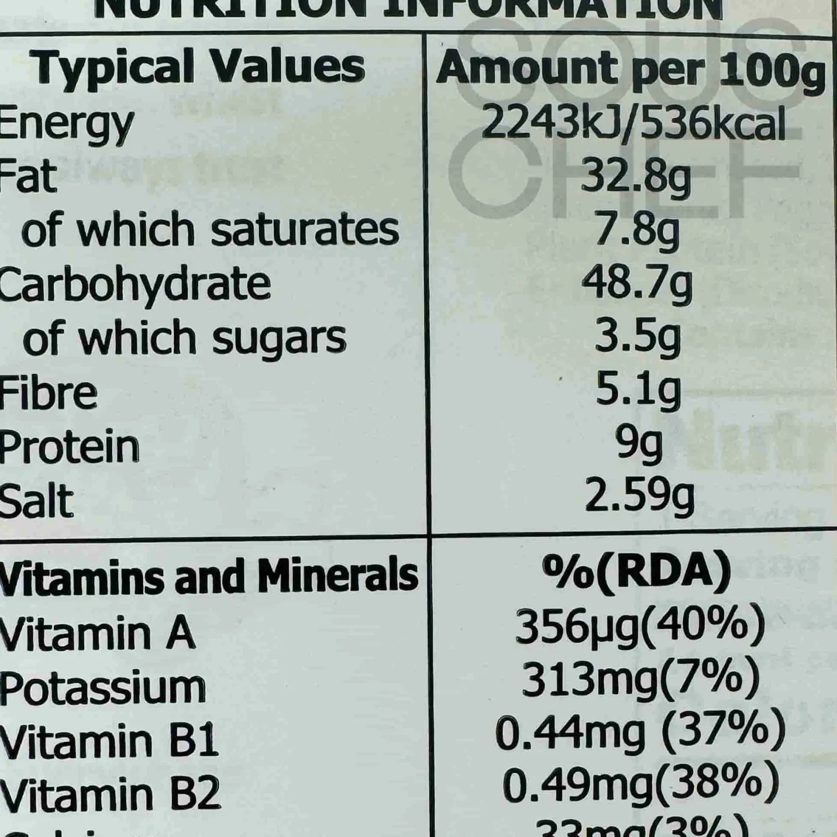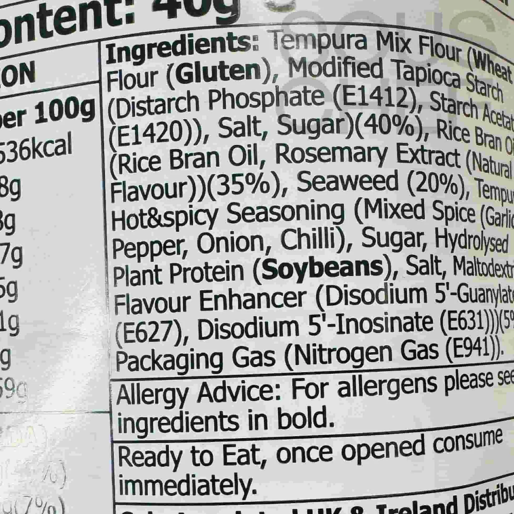 Product formulations and details may change. For the latest ingredients and allergen information always check product packaging prior to consumption. Ingredients: Tempura mix flour (Wheat flour (Gluten), modified tapioca starch (Distarch Phosphate (E1412), starch acetate (E1420)), salt, sugar)(40%), rice bran oil (rice bran oil, rosemary extract (natural flavour))(35%), seaweed (20%), tempura hot & spicy seasoning (mixed spice (garlic, pepper, onion, chilli) sugar, hydrolysed plant protein (soybeans), salt, maltodextrin, flavour enhancer (disodium 5′-guanylate (E627), disodium 5′-Inosinate (E631)))(5%), Packaging gas (nitrogen gas (E941)).