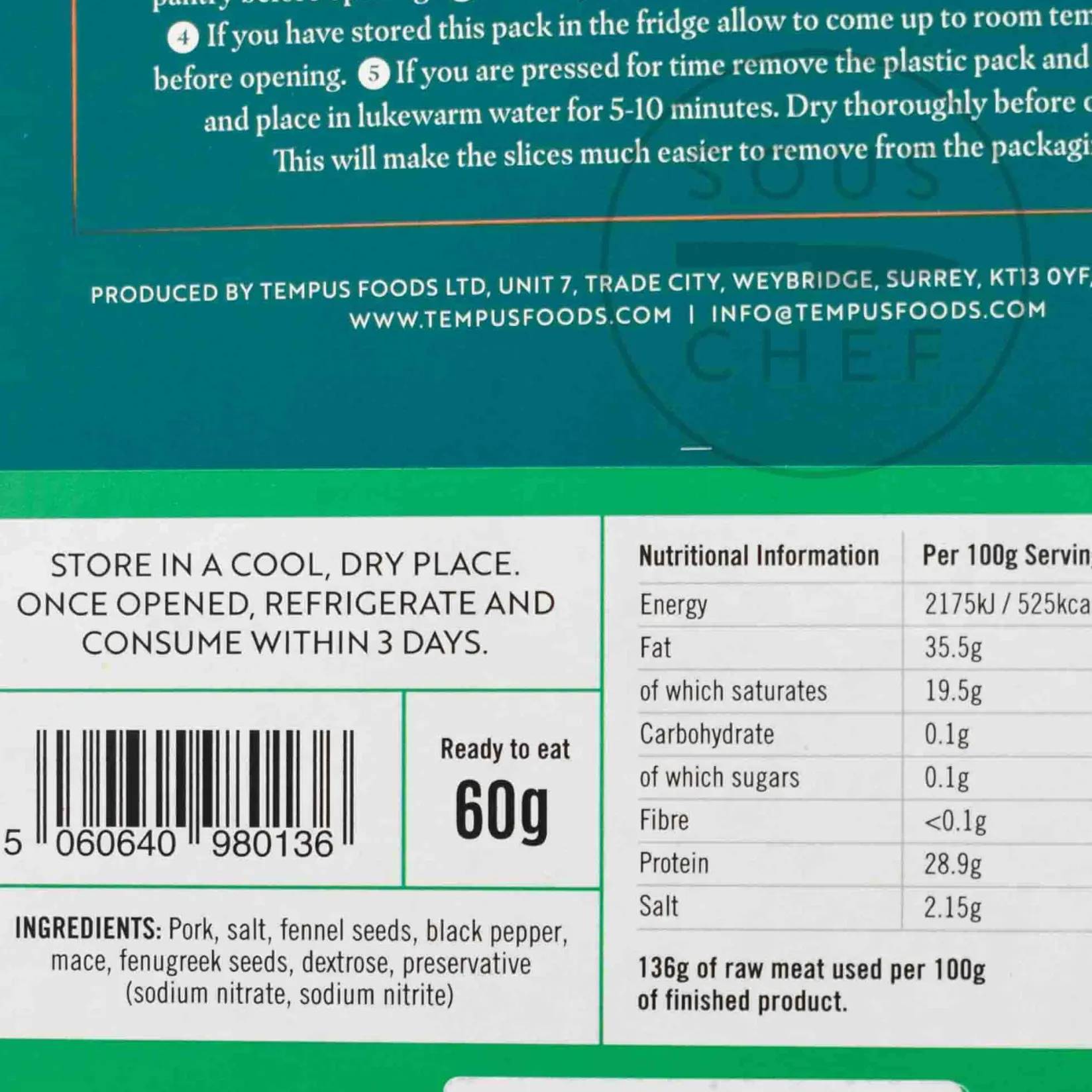 Product formulations and details may change. For the latest ingredients and allergen information always check product packaging prior to consumption. Ingredients: Pork, salt, fennel, black pepper, nigella seed, mace, fenugreek, dextrose, sodium nitrate