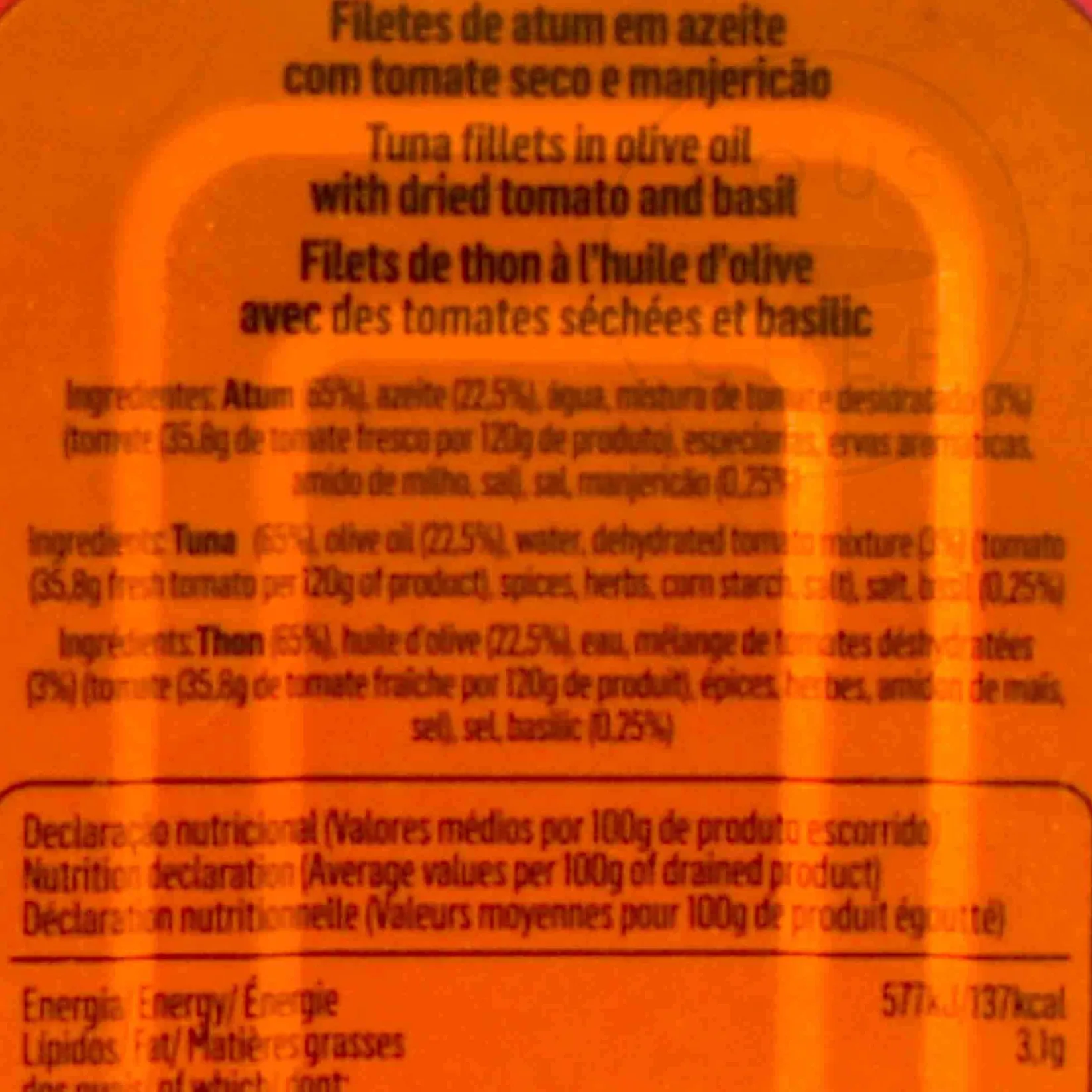 Product formulations and details may change. For the latest ingredients and allergen information always check product packaging prior to consumption. Ingredients: Tuna fish (65%), olive oil (22.5%), water, dehydrated tomato mixture (3%)(tomatoes (35.8g of fresh tomatoes per 120g of product), Spices, Herbs, Cornstarch, Salt), Salt, Basil (0.25%)