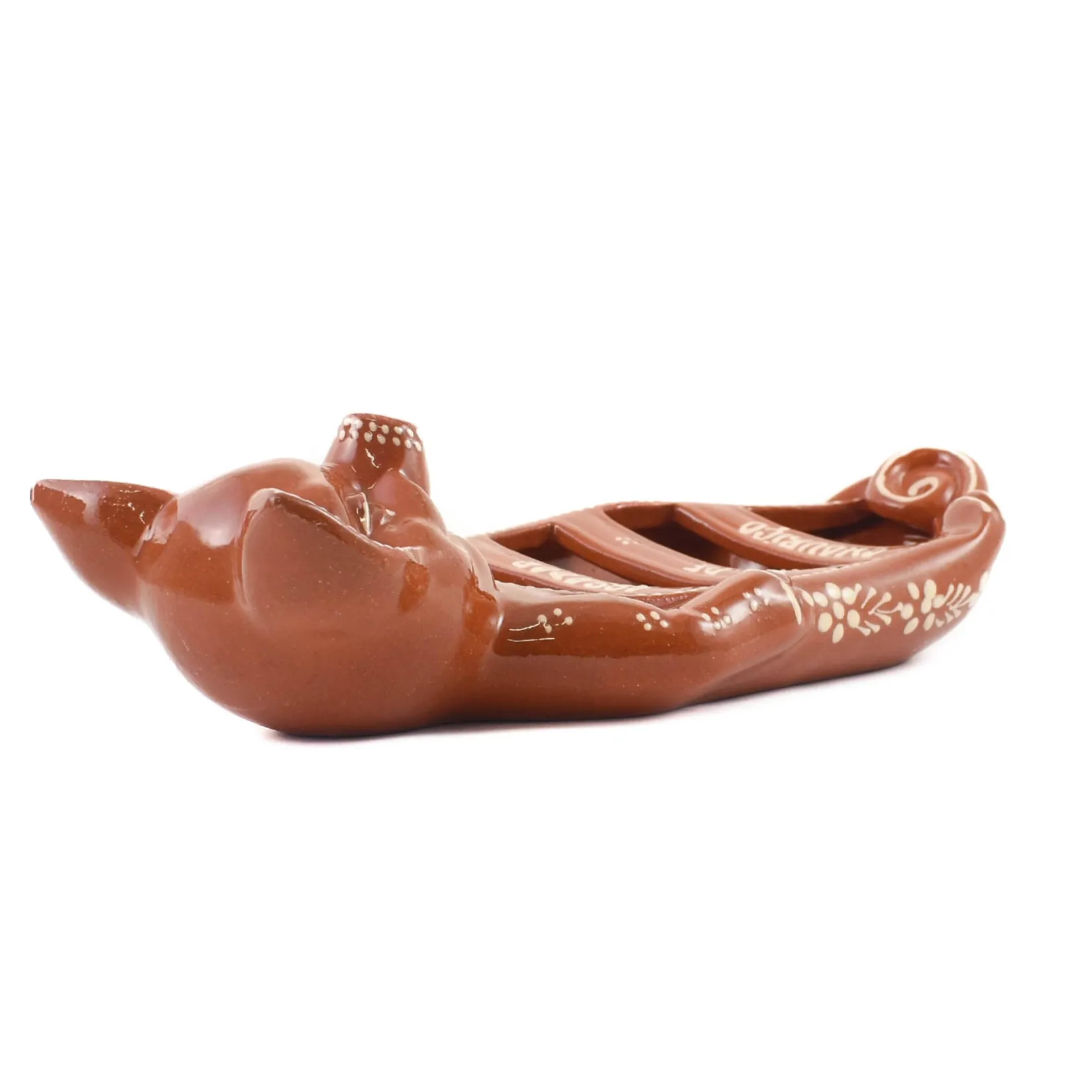 Use this terracotta chorizo pig serving dish to flame spicy sausages at your dinner table. Handmade in Portugal, clay sausage roasters like this one are a familiar sight at barbecues, family gatherings and taverns known as tasquinhas. They are used to grill and flambé all kinds of sausages, from spiced chouriço and linguiça to rustic morcela (similar to black pudding). Shaped like a pig standing proudly to attention, the deep red dish has hand-painted details that give it a charming, rustic look.