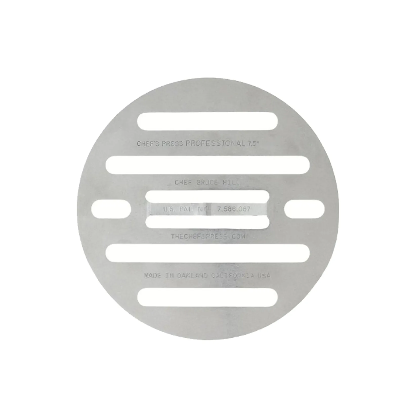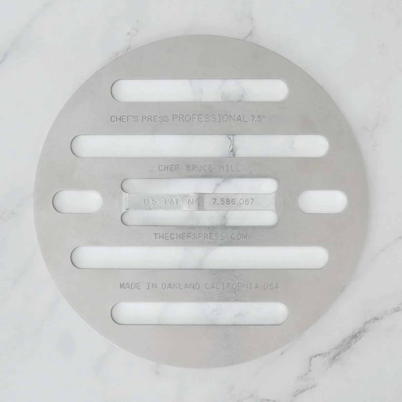 The Chef’s Press was created by Chef Bruce Hill while he was working in a tiny kitchen of Bix Restaurant in San Francisco. The traditional cast iron weights were too heavy for many dishes and also trapped steam.