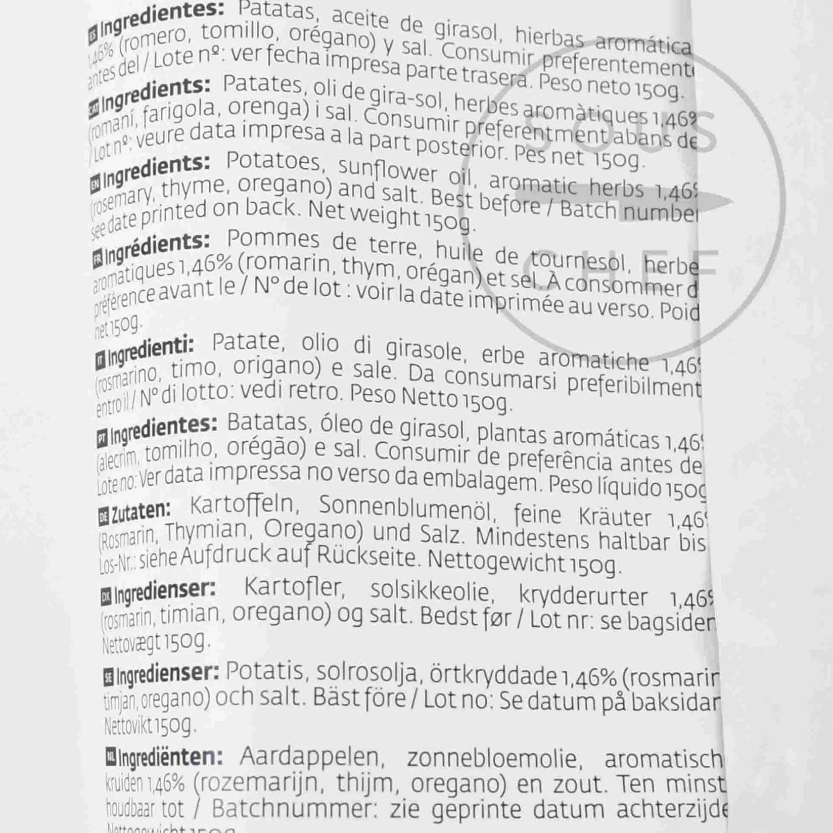 Product formulations and details may change. For the latest ingredients and allergen information always check product packaging prior to consumption. Ingredients: Potatoes, sunflower oil, aromatic herbs (1.46%) (rosemary, thyme, oregano), and salt.