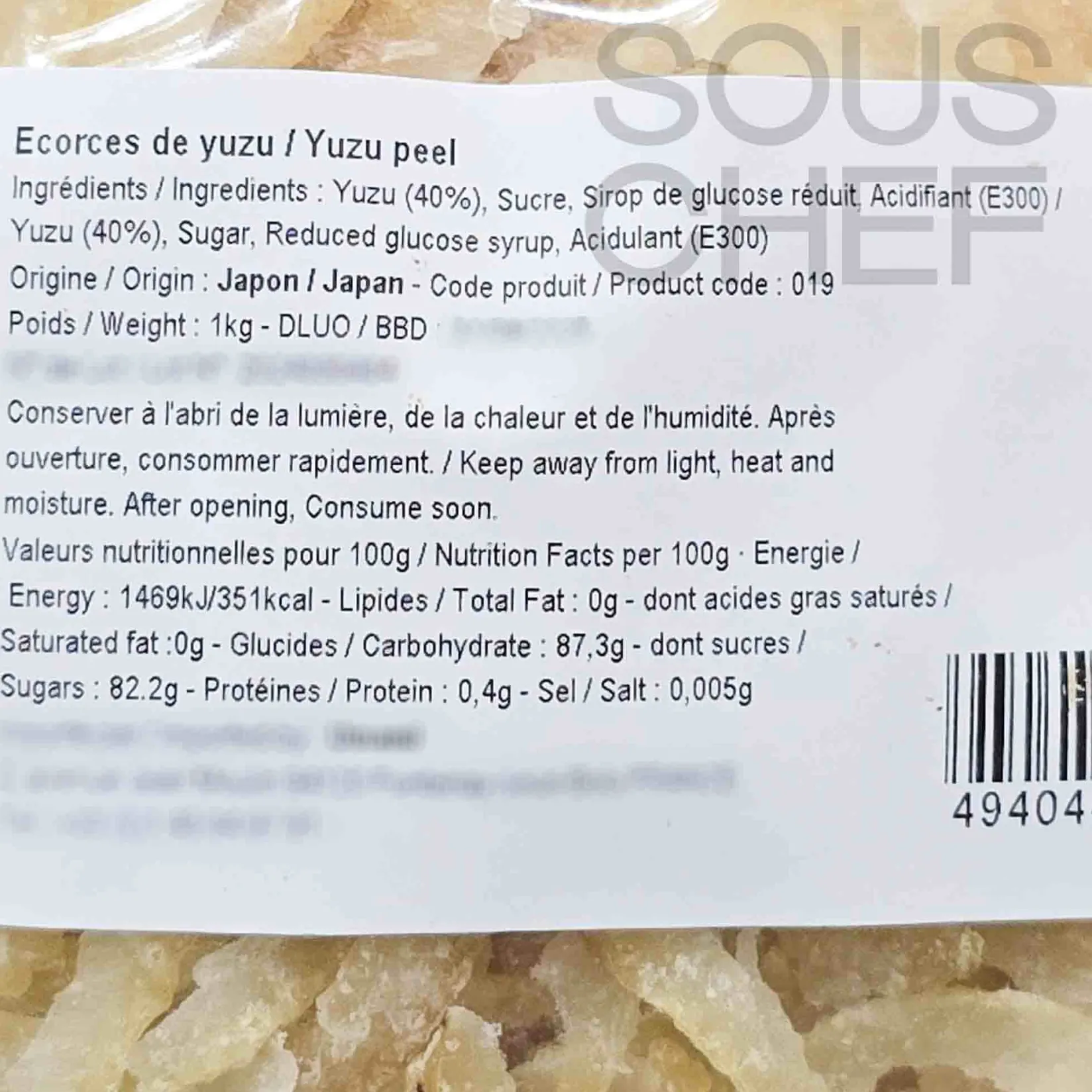 Candied yuzu peel adds a burst of citrus flavour to biscuits and desserts. It has a sweet-sharp flavour similar to grapefruit and mandarin. Enjoy it straight from the bag or use it to garnish cakes and éclairs.